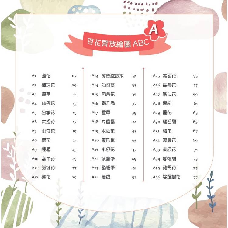 《百花齊放繪圖ABC》全套共三冊,其中 A 冊以「平安吉祥」為主題,精選 36 種花草,透過圖像與文字,引領讀者走入花語與生命智慧交織的世界。