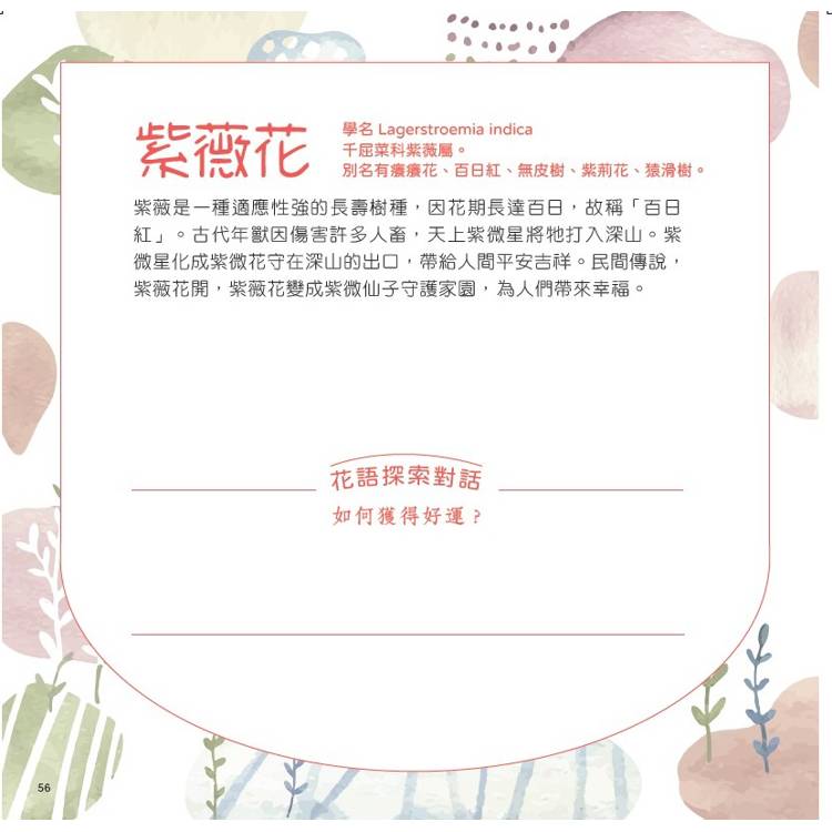 作者覺年法師深受星雲大師《佛光菜根譚》啟發,以「心保與環保」為創作初心,將生命教育融入繪本之中。書中特別設計可愛的 Q 版花草插畫,並保留充足留白空間,邀請讀者自由塗鴉、書寫與創作。你可以臨摹自然的色彩,也能依心情揮灑想像;可以在花瓣與枝葉之間,記錄當下的感受、體悟與心境。