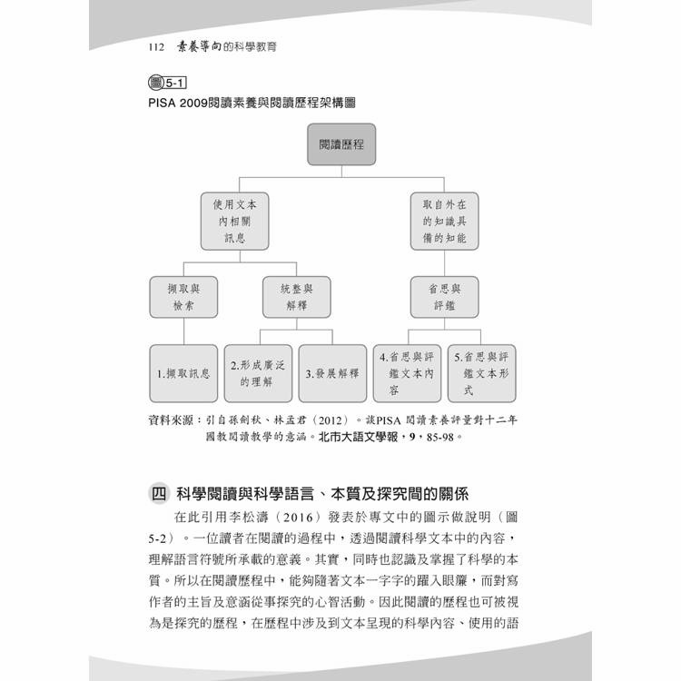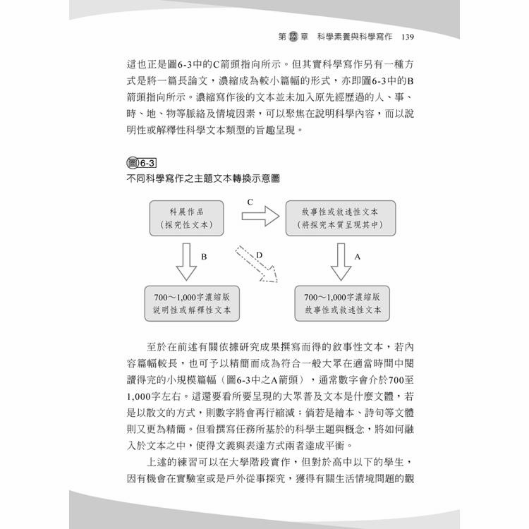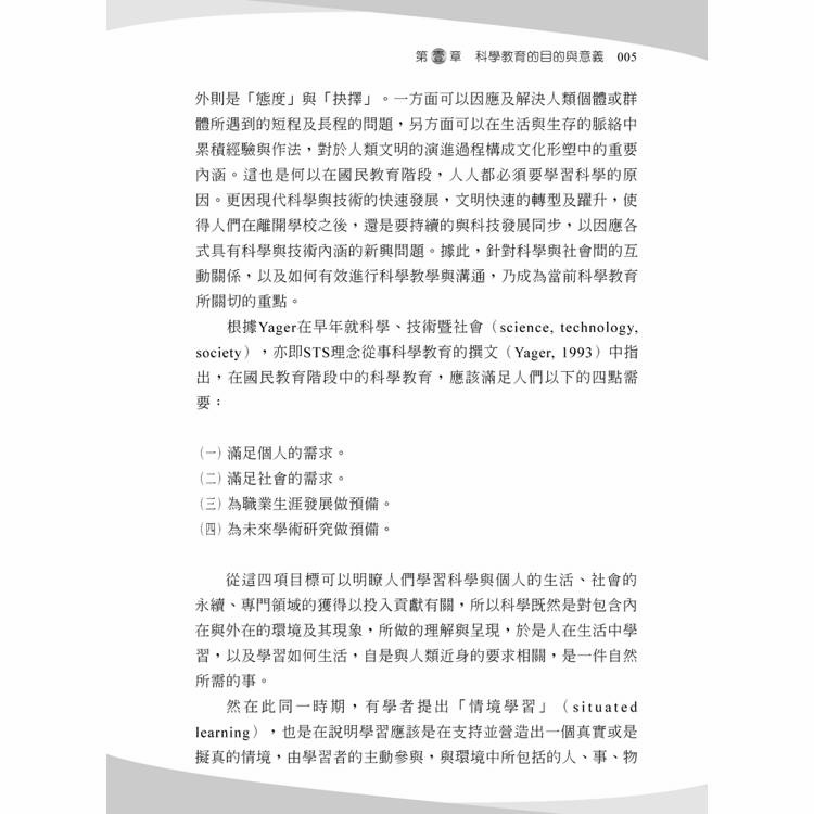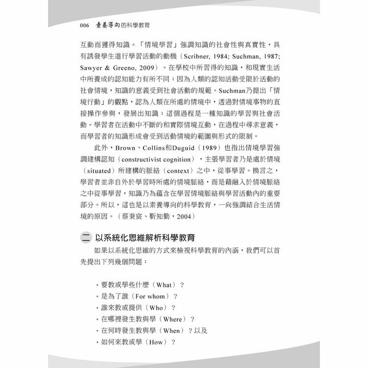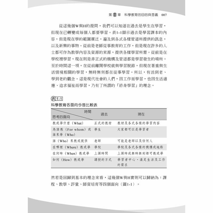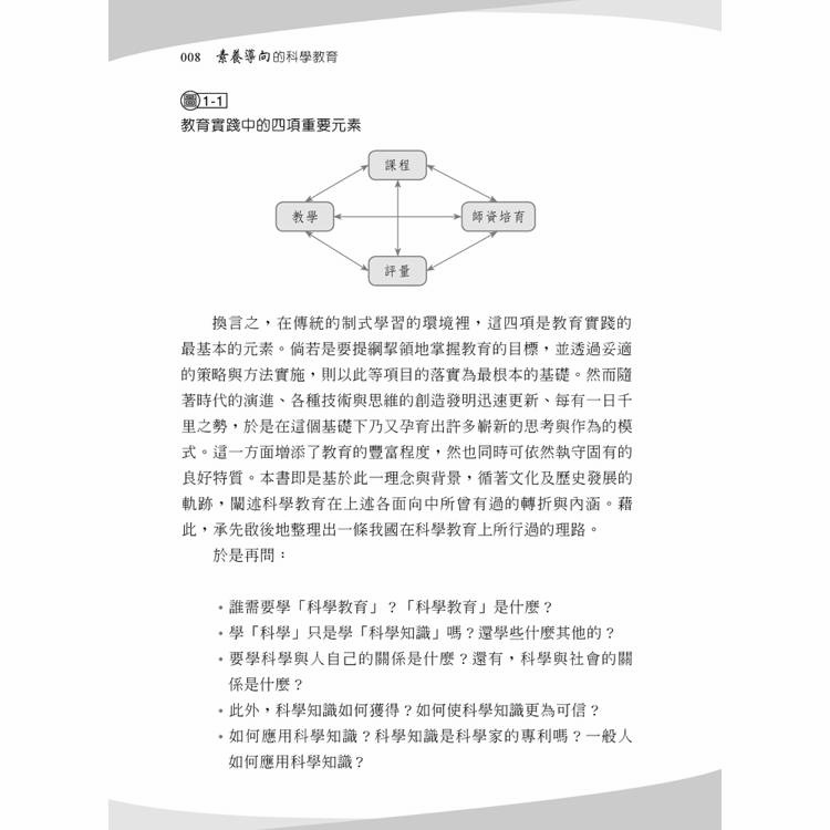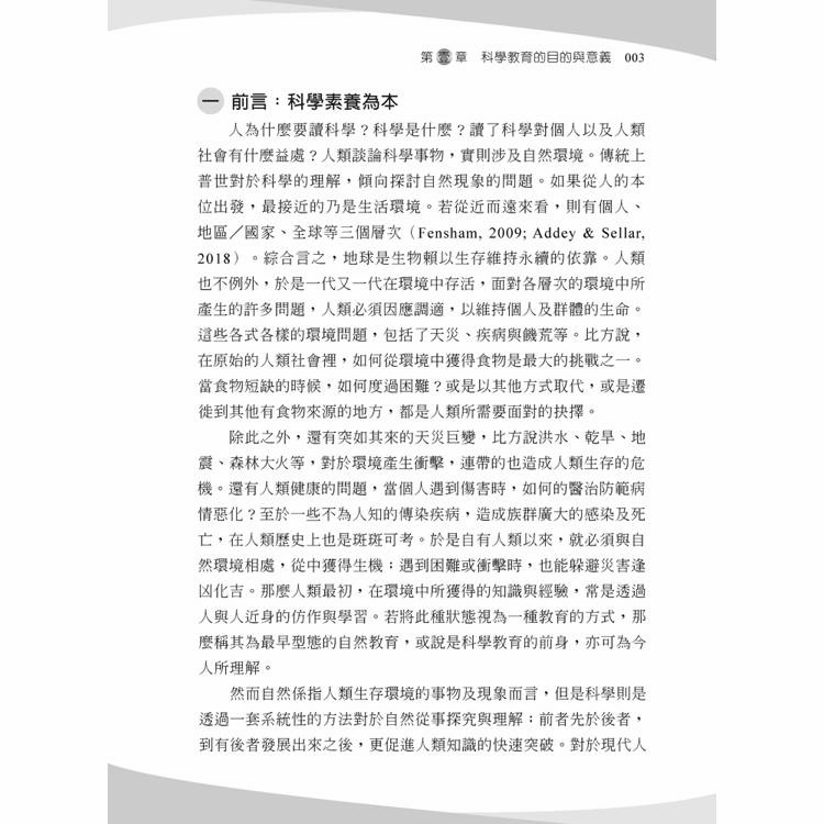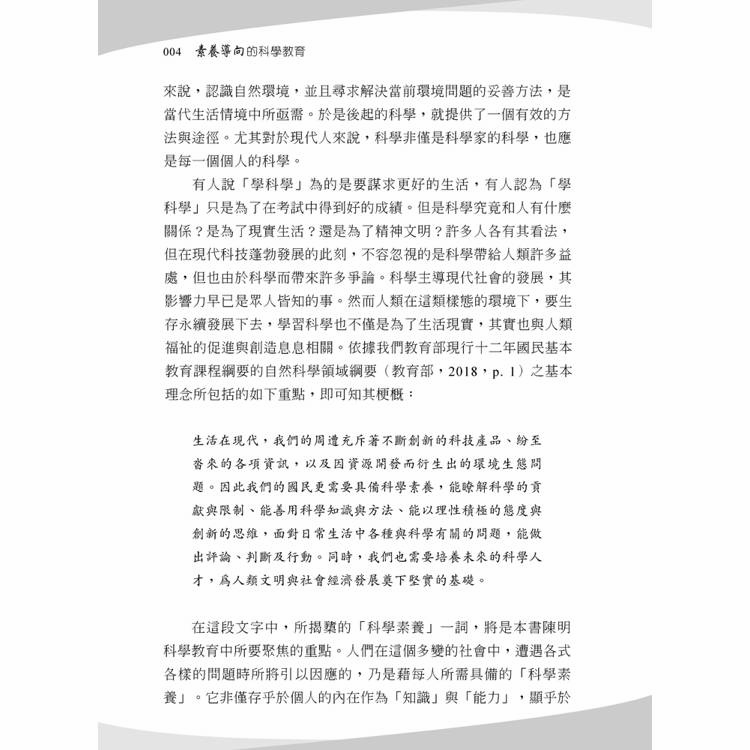 本書以素養導向闡述科學教育的宗旨及其實踐,書中首先以系統化思維的方式,介紹科學教育之目標與意義,並說明當前課綱與之關聯。隨之,闡述科學教育聚焦於素養導向,結合生活情境之意義與重要性;並且藉探究與實作的角色解析,說明科學社群從事問題解決透過探究,及與一般學生學習探究的必要性。由於科學素養乃生活中所需之知識與能力,本書中特別就其來由之背景與發展做說明,並強調在生活中之應用,以及作為終身學習實踐的核心意義。本書另根據學習表現與能力養成的宗旨,在探究歷程中運用實作與思考之外,亦介紹國際科學素養的發展及近況,以及讀寫與論證的策略與功能。為連結生活情境及終身學習,以利讀者理解及應用,本書並且介紹非制式科學教育的理論、現況及其與科學能力養成之關係。
