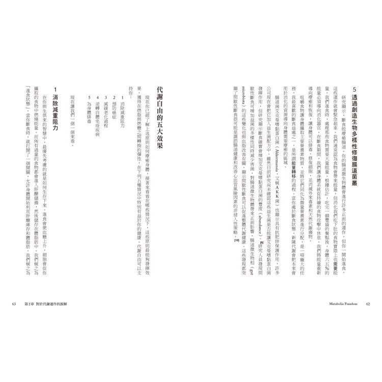 4. 三十天重啟計畫+健康美味的49道食譜,實現代謝自由:作者曾指導超過五千名學員成功燃燒脂肪而不是糖,而且沒有任何症狀!利用簡單的方法就可以實現第一步:避免精緻糖、精緻麵粉等食物、飲用書中提到的生酮特調,以及避免在兩餐之間吃零食。食譜列出了有益代謝的豐富食材,讓你盡情享受原型食物的美味和飽足感。