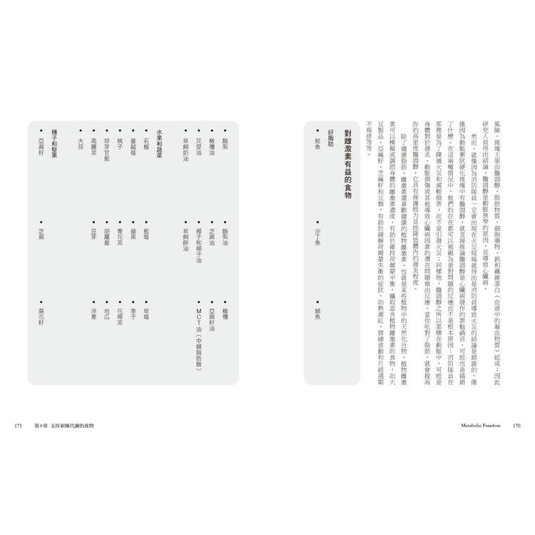 2. 正確使用生酮、斷食等古老療癒策略,擺脫反覆減重、慢性發炎的痛苦循環:最常見的細胞膜發炎相關症狀是體重增加和減重阻力。作者帶領超過五千人進行生酮後,發現無法成功執行生酮的首要原因是反應遲緩的肝臟,建議攝取有助於肝臟分解脂肪的苦味食物,例如有機咖啡、芝麻葉、檸檬、葡萄柚等,效果會更好。而斷食已被研究證實能降低血壓、改善消化功能、促進大腦健康和新陳代謝效率。作者建議從12小時的間歇性斷食開始,再逐漸過渡到更長時間的斷食。