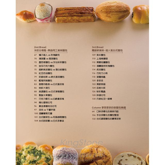 ◎善用台式麵包的特點,教您3種基本麵團作法,直接法、中種法、湯種法,活用麵團特色與製作、內餡變化,做出各種不同款式麵包!