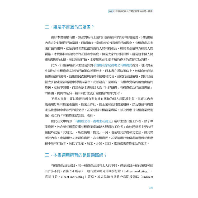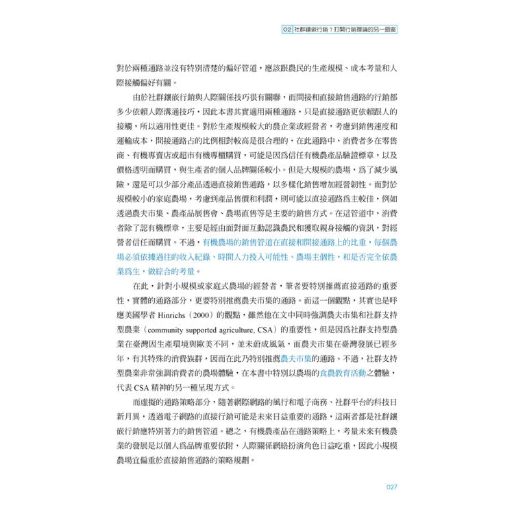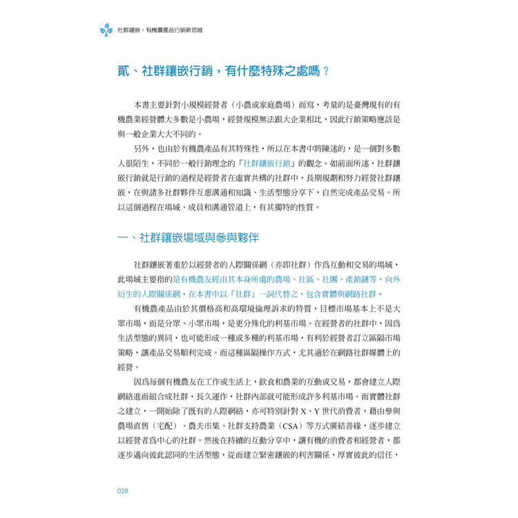 所以,這本書是為了嘗試跳越井底之蛙的窘境而寫,是一本不是行銷專業領域的人寫的行銷的書,但是絕對是跨領域的,而且結合理論與實務,而本書所提出的「社群鑲嵌行銷」一詞,更是大膽的嘗試。但是要讓有機農業眾多經營者接受,它有機會嗎?