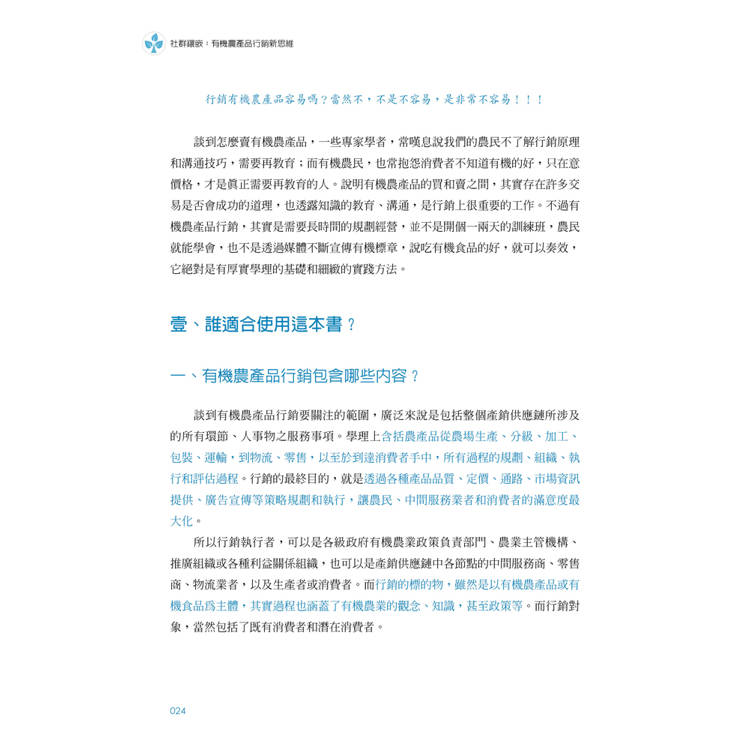 本書適合青農、農業科系師生、行銷從業人員及關心農業永續的讀者閱讀。期盼透過社群的力量,讓有機農業不只是一項產業,更成為一種永續共好的生活實踐。