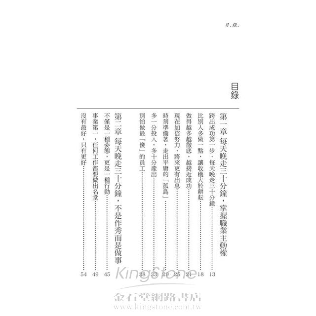 「每天晚走三十分鐘」,是一種主動和自動自發的工作態度的展現。下班後比別人晚走一點,主動去做一些分內分外的工作,才可以得到更多賞識。當每天晚走三十分鐘成為一種習慣時,你也就擁有了事業成功的通行證。