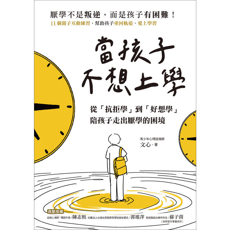 ──結合多年來實際面對10~18歲青少年的諮商經驗,以專業心理學背景,教你看懂孩子厭學、拒學、懼學的腦內風暴,才能用對解決方法,幫孩子找回學習動力。