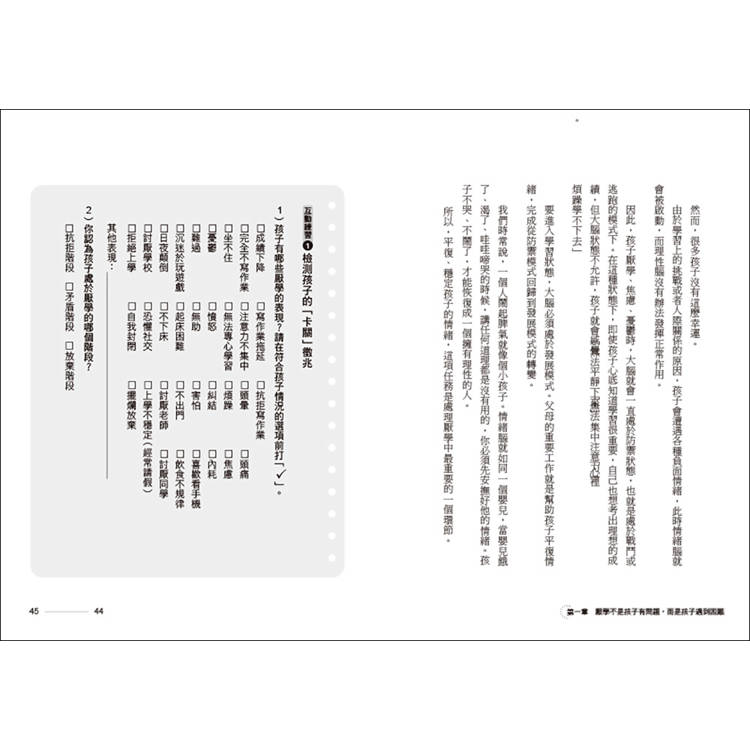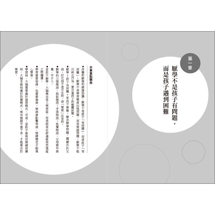 ──孩子不想上學,往往是先從課業壓力、環境不適應、人際問題等「產生因素」開始,再隨著親子衝突、憂鬱、網路成癮等「加深因素」而逐漸惡化,變得不想讀書、也不想上學。本書將從這兩大因素著手,教你如何徹底掐斷厭學的根源。