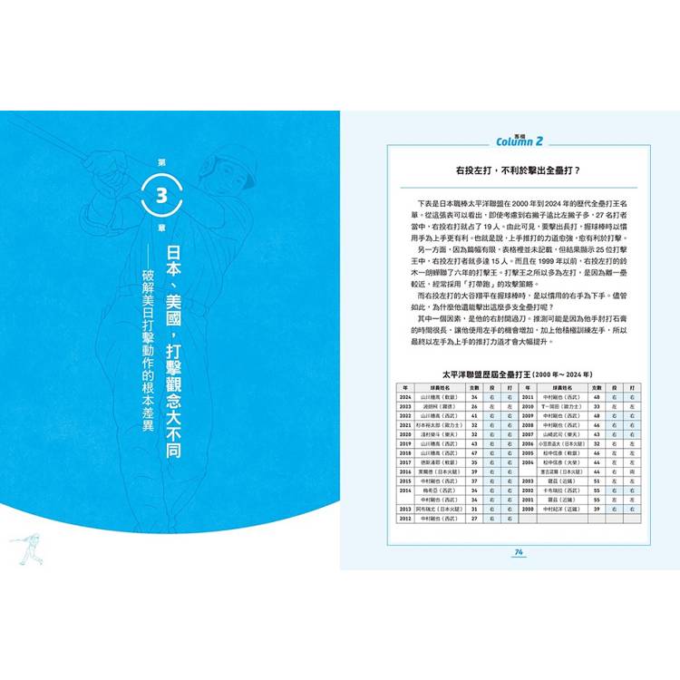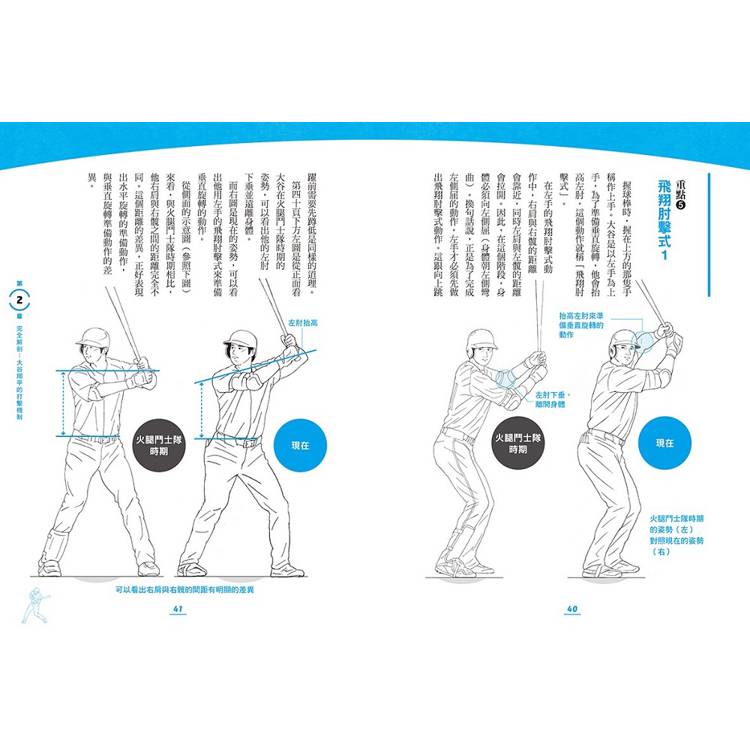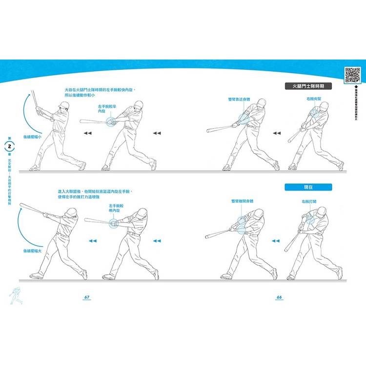 書中把日本火腿時期與現在的打擊姿勢差異清楚呈現,並以理論搭配插圖,解說為什麼全壘打變多了、飛行距離變遠了,這正是本書劃時代的地方。