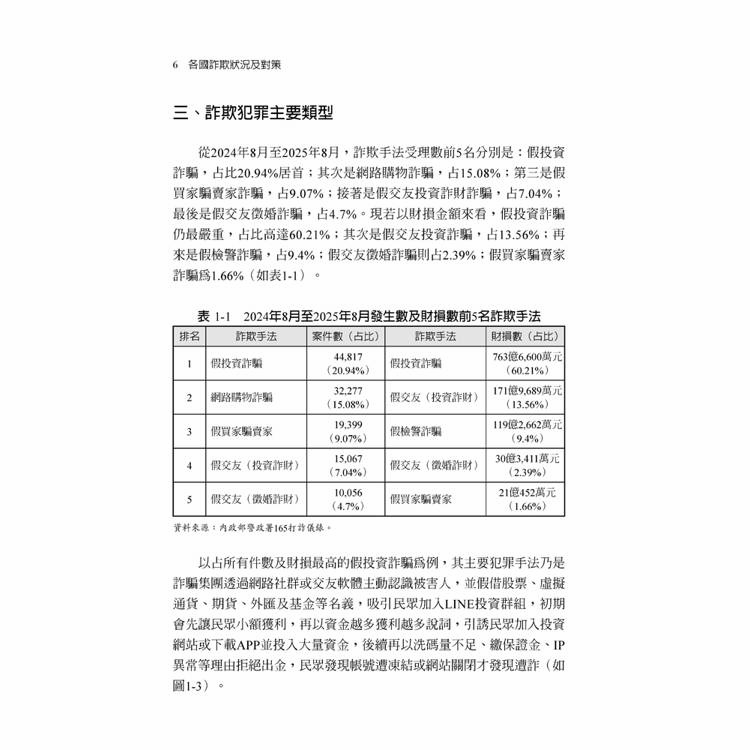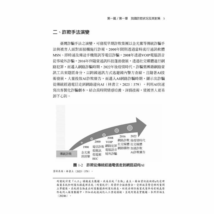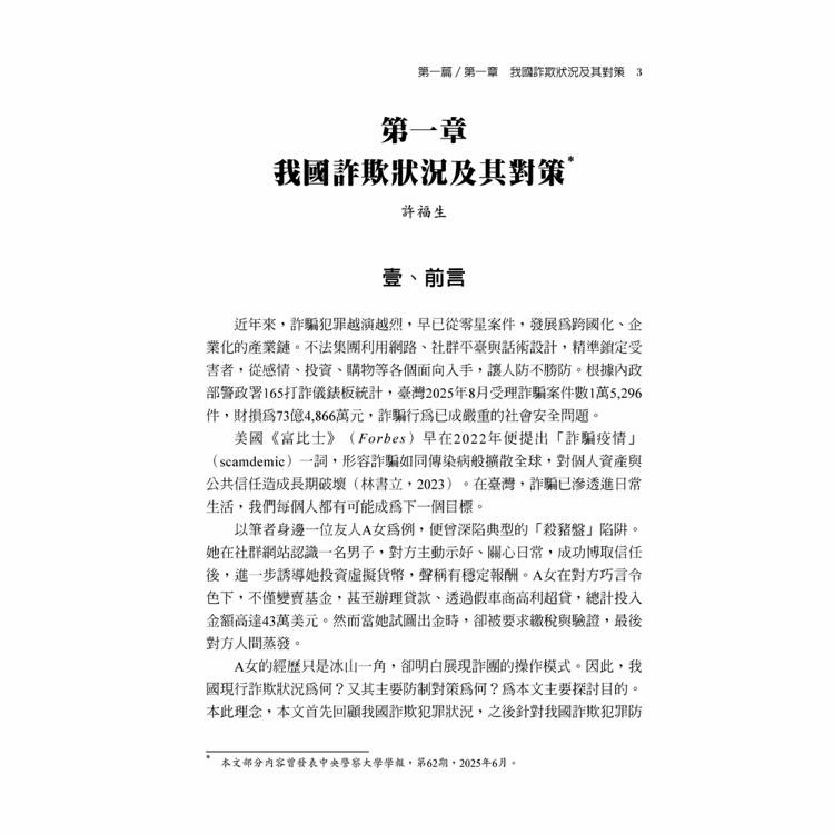 第三篇則著重於「詐欺犯罪偵查與防治」的實務層面,內容涵蓋電信與網路詐欺之偵辦策略、數位證據的蒐集與運用、虛擬貨幣詐欺之偵查模式、司法警察取證的適法性問題,以及基層員警與分局長在打詐實務中所面臨的困境。此外,亦納入銀行臨櫃攔阻及特定詐欺類型之案例訪談分析,並進一步探討AI科技浪潮對詐欺犯罪樣態所帶來的嶄新挑戰與被害防治策略,使本書不僅止於制度論述,更能緊密貼合第一線執法與防治實務。