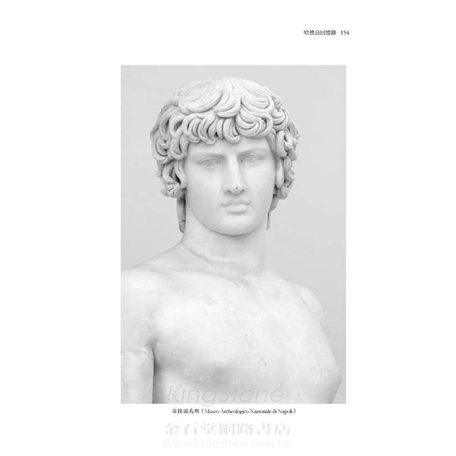 哈德良是羅馬帝國五賢帝之一,西元一一七至一三八年在位。除了秦始皇,史上另一位也築過長城的皇帝就是哈德良,他曾經到過不列顛行省,築起北方邊境。哈德良熱愛出巡,中東、北非等地都曾留下足跡,在位二十年有十二年居無定所。然而他最為後人不斷傳說的,是與希臘美少年安提諾烏斯的戀情,安提諾烏斯於尼羅河溺水而死後,哈德良在尼羅河畔蓋了一座名為安提諾的城市。總結哈德良一生,文化與感情上的歸宿都是希臘。