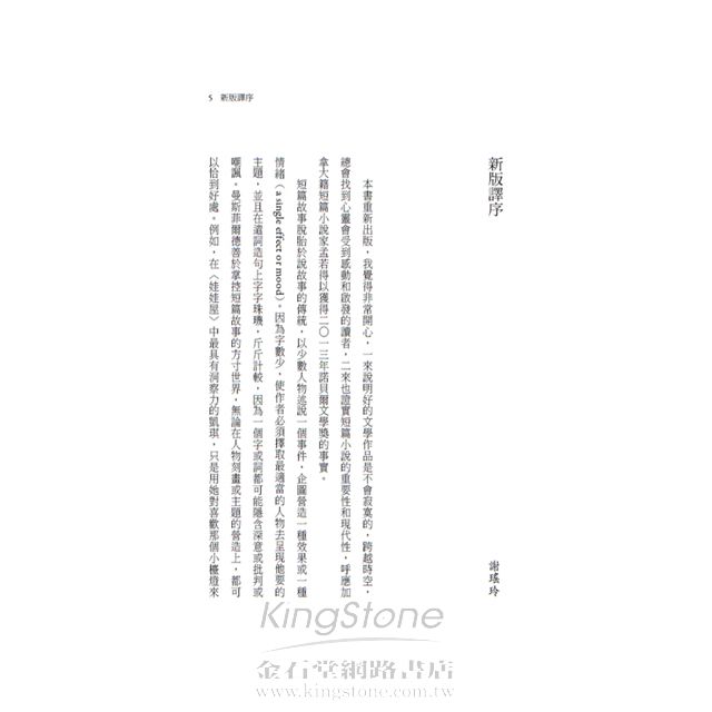 本書重新出版,我覺得非常開心,一來說明好的文學作品是不會寂寞的,跨越時空,總會找到心靈會受到感動和啟發的讀者,二來也證實短篇小說的重要性和現代性,呼應加拿大籍短篇小說家孟若得以獲得二○一三年諾貝爾文學獎的事實。