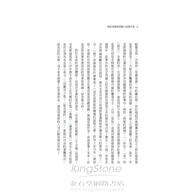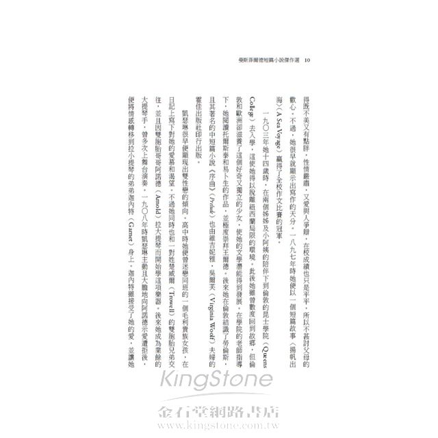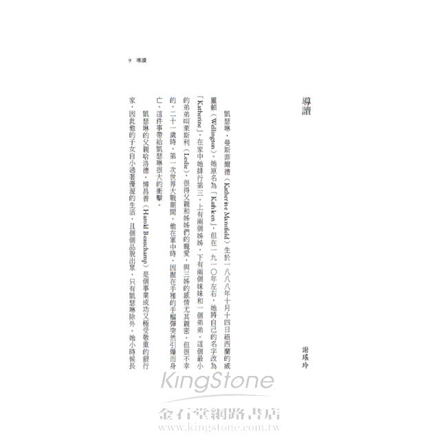 曼斯菲爾德是個充滿傳奇色彩的作家,她不尋常的短暫生命,在〈導讀〉中已有詳細介紹,不再贅言。我只覺得,雖然她一生多病,但因為生病與感情上的種種波折,反而讓她對人生有異於常人的早熟體悟,使她的故事在生動呈現各種或膚淺或清靈的人物之時,也透露出對人情世事的洞悉和淡然,這應該是她的故事最不與人同的特色,也是為何她會被認為寫作手法之高明直可與俄國短篇小說大師契訶夫和愛爾蘭文學奇才喬伊斯並列。我甚至覺得,這種對人情世故的淡然,雖只是透過短篇故事的傳達,卻與寫《紅樓夢》的曹雪芹幾乎如出一轍呢。
