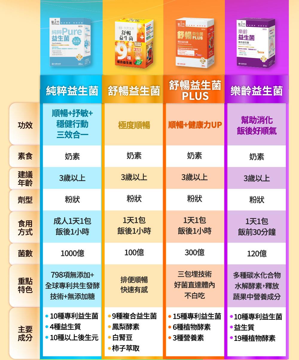 成份: 乳酸菌粉(含乳糖、乳糖醇(甜味劑)、Bifidobacterium bifidum、Bifidobacterium . Lactis BS01、Bifidobacterium breve BR03、Bifidobacterium longum、Lactobacillus reuteri、Lactobacillus paracasei、Lactobacillus plantarum LP01、Lactobacillus rhamnosus、Lactobacillus casei、Lactobacillus salivarius、Lactococcus lactis subsp. lactis、Lactobacillus acidophilus、 Lactobacillus fermentum、Lactobacillus johnsonii、Streptococcus thermophiles)、氧化鎂、D-山梨醇(甜味劑)、黑嘉麗果汁粉[砂糖、麥芽糊精、黑嘉麗濃縮汁、蘋果濃縮汁、檸檬酸、檸檬酸鈉、香料(香料、焦糖色素)、食用紅色六號]、檸檬酸、蘋果濃縮汁、阿拉伯膠、脫脂奶粉、複合寡多糖[菊糖(菊苣纖維)、果寡糖、木寡糖、半乳寡糖]、鳳梨萃取物(含鳳梨酵素)、香料、蔓越莓果汁粉(麥芽糊精、蔓越莓濃縮汁、葡萄汁色素、辛烯基丁二酸鈉澱粉、黑加侖濃縮汁、檸檬酸、蔓越莓香料)、花果抽出物(洛神花、接骨木莓、玫瑰果、檸檬皮、香料、麥芽糊精)、維生素C、中鏈脂肪酸甘油酯粉(中鏈脂肪酸、麥芽糊精、麥芽糖漿、酪蛋白鈉、脂肪酸甘油脂、乳酸硬脂酸鈉、磷酸氫二鉀、多磷酸鈉、維生素E)、大豆發酵萃取物、酵素水解小麥蛋白(含麩醯胺酸胜肽)、甜菜根粉、牛蒡萃取物、植物綜合酵素(麥芽糊精、澱粉分解酵素、蛋白分解酵素、脂肪分解酵素、乳糖分解酵素、纖維分解酵素)、柿子抽出物。