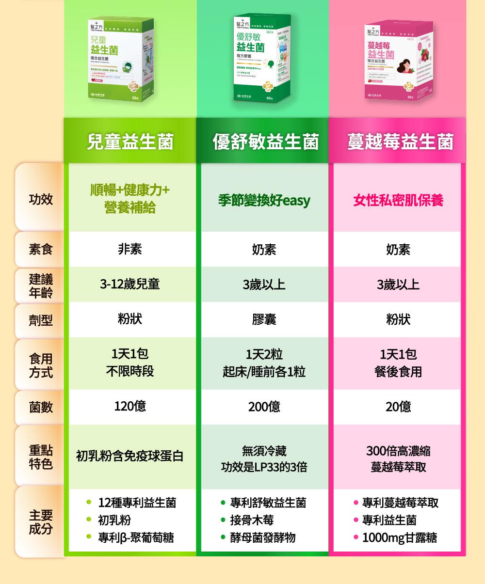 成份: 乳糖、蔗糖、難消化性麥芽糊精、D-山梨醇(甜味劑)、葡萄糖、嗜熱鏈球菌(含麥芽糊精、嗜熱鏈球菌Streptococcus thermophilus)、綜合酵素[含麥芽糊精、澱粉分解酵素、植酸酵素、葡萄糖澱粉酵素RO、複合酵素(含脂肪分解酵素、蛋白質分解酵素、澱粉分解酵素、麥芽糊精)、中性蛋白質分解酵素、鳳梨酵素、蛋白質分解酵素4.5、轉化酵素、蛋白質分解酵素3.0、半纖維素分解酵素、果膠酵素、α-半乳糖苷酶、蛋白質分解酵素AM、脂肪分解酵素、胜肽分解酵素、乳糖分解酵素、蛋白質分解酵素6.0、澱粉酵素、纖維素分解酵素AN]、阿拉伯膠、鳳梨果汁粉(含鳳梨濃縮汁、麥芽糊精、檸檬酸、香料、β-胡蘿蔔素)、乳果寡醣、蘋果濃縮汁、果寡糖、二氧化矽、香料(含乳糖、二氧化矽、β-環狀糊精、丙二醇、香料)、黃金奇異果粉(含黃金奇異果粉、微結晶狀α-纖維素、二氧化矽)、DL-蘋果酸、檸檬酸、β-胡蘿蔔素[含葡萄糖漿、阿拉伯膠、中鏈三酸甘油酯、蔗糖、L-抗壞血酸鈉(抗氧化劑)、β-胡蘿蔔素、二氧化矽、維生素E(抗氧化劑)]、酪酸菌(含麥芽糊精、酪酸菌Clostridium Butyricum)、雷特氏B菌(含雷特氏B菌Bifidobacterium lactis、麥芽糊精)、龍根雙歧桿菌(含龍根雙歧桿菌Bifidobacterium longum、麥芽糊精)、比菲德氏菌(含麥芽糊精、比菲德氏菌Bifidobacterium bifidum)、比菲德氏短雙歧桿菌(含比菲德氏短雙歧桿菌Bifidobacterium breve、海藻糖、玉米澱粉)、芽孢乳酸菌(含麥芽糊精、芽孢乳酸菌Bacillus coagulans)、副乾酪乳酸桿菌(含麥芽糊精、副乾酪乳酸桿菌Lactobacillus paracasei、微結晶狀α-纖維素)、鼠李糖乳桿菌(含鼠李糖乳桿菌Lactobacillus rhamnosus、麥芽糊精)、嗜酸乳酸桿菌(含嗜酸乳酸桿菌Lactobacillus acidophilus、海藻糖、玉米澱粉)、黑酵母發酵物(含β-聚葡萄糖)