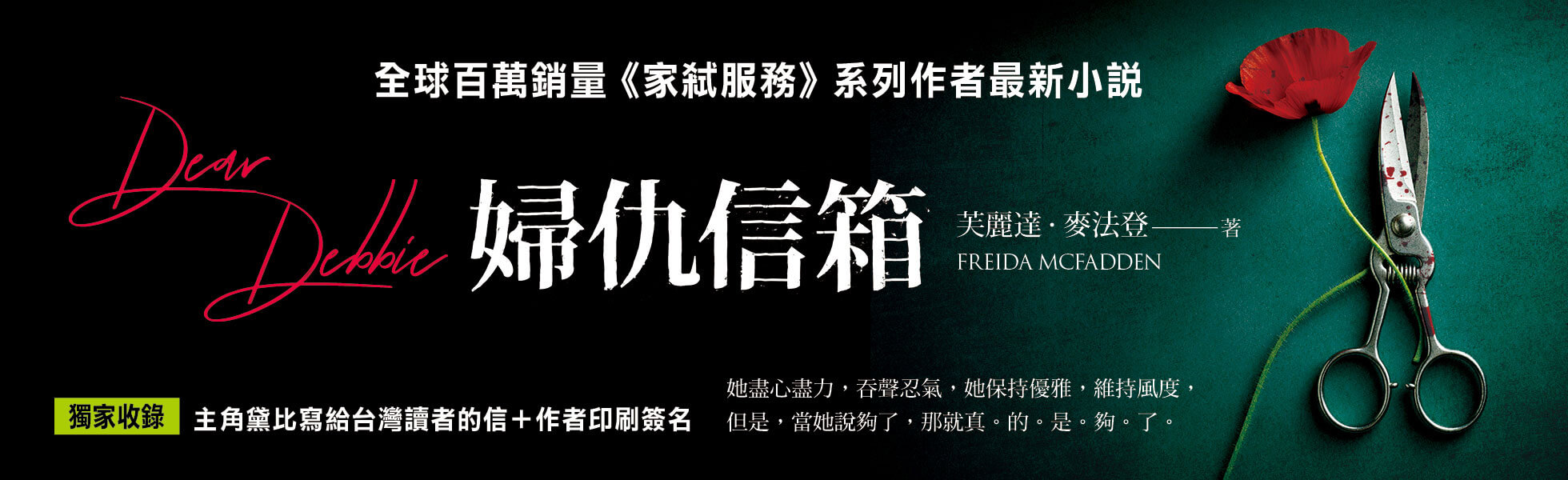 【內容簡介】她盡心盡力,吞聲忍氣,她保持優雅,維持風度,但是,當她說夠了,那就真。的。是。夠。了。人生總有忍無可忍,無需再忍的時刻……現象級驚悚小說家.「家弒」女王.最新作品全球書商熱烈籌備,台灣領先上市!出版前售出影視改編權,由《安眠書店》製作人親自操刀!*********** 獨 家 收 錄*************主角黛比寫給台灣讀者的信+作者印刷簽名(金萱紙 ╳ 綠字印刷)****************************** 閱讀腎上腺素、文字多巴胺,就是這一本!冬陽、李柏青、麟左馬、嗚喵、B編──痛快推薦紅遍五大洲,全球百萬銷量《家弒服務》系列作者最新小說黛比.慕倫覺得自己快。瘋。了。多年來,星漢鎮的家庭主婦寫信到「黛比信箱」尋求她的安慰和建議,她也盡其所能提供有用的方法和忠告,解決她們的煩惱。透過這個報紙上的小專欄,黛比聽到無數婦女遭受丈夫冷落、貶低甚至虐待的心聲。為了幫助這些女性拿回生活主控權,她毫無保留,盡心盡力。至少,過去的她確實如此。然而,最近她的生活突然變得一團亂。不但丟了工作,兩個青春期女兒也不太對勁,丈夫更有事情瞞著她,她在他手機上安裝的定位追蹤APP就是鐵證。黛比受夠了當逆來順受、冷靜理性、實事求是的人。該是她把勸別人的話付諸行動的時候了。她要替天行道,畢竟,罪有應得的人就該加倍奉還!而且,當黛比夫人說:「夠了!」就是夠了!!!喜歡《家弒服務》米莉的人,看了這本絕對會加入黛比啦啦隊!──書單雜誌,星級好評黛比那始終如一的(黑暗)道德準則,保證讓人看完之後臉上露出壞笑。──出版人週刊⚠️ 貼心提醒:追讀強迫症,劇烈發作!〔各界讚譽〕▲還好《婦仇信箱》只是本小說,否則很難表達我對這位寫報紙專欄的家庭主婦兼賢妻良母黛比(別用你的刻板印象來理解這看似溫良恭儉讓的頭銜),究竟是愛她還是恨她或怕她也許小小贊同她……腦洞大開、手段過激的行動背後其實蘊藏著吶喊控訴,用極端戲劇表現來凸顯大眾切身議題是芙麗達.麥法登的拿手好戲!──冬陽(推理評論人)▲人生難免有「他怎麼不去死?」的時刻,但是處理屍體實在太麻煩了。避免麻煩,需要智慧。你可以提筆寫信給智商一七八的家庭主婦黛比,也可先讀《婦仇信箱》裡她為星漢鎮婦女排憂解難的紀錄,裡頭說不定有你需要的溫腥智慧,還不留痕跡。──麟左馬(作家)▲《婦仇信箱》是一首獻給那些失序、失控,卻重新奪回自身力量的女性之頌歌。──吉娜·吉羅拉摩,《安眠書店》製片人▲喜歡《家弒服務》米莉的人,看了這本絕對會加入黛比啦啦隊!──《書單雜誌》,星級好評▲黛比那始終如一的(黑暗)道德準則,保證讓人看完之後臉上露出壞笑。──《出版人週刊》〔讀者狂熱 ★★★★★ 推薦〕◆天哪! 快去看!!我大腦剛剛搭了一趟雲霄飛車。◆我之前只讀過麥法登一本書……現在一個月就讀了兩本……我徹底淪陷了。太愛《婦仇信箱》了!!十顆星◆這本書簡直太瘋狂了……黛比是我最喜歡的角色類型。她瘋得好迷人……◆那結局,哇!我竟然一天就刷完了。根本停不下來!!拜託誰現在快去看吧,快來找我聊!◆書中充滿了崎嶇迂迴的線索和情節轉折,讀者在一場驚心動魄冒險中,體驗背脊發涼,腦袋發燒!◆我花四小時就讀完了,完全治好我的閱讀低潮!◆「親愛的黛比」的建議回答讓我忍不住大笑出聲。◆黛比的生活一團糟……不過別擔心,一切盡在掌握,敬請期待她給的建議吧!◆黛比絕對是那種讓人欲罷不能的瘋癲角色。她是我在驚悚小說裡讀過的最令人難忘的主角之一:混亂、迷人、精神錯亂,卻讓人無法移開視線。◆黛比這個角色太討人喜歡了,生活一團亂,解方很奇葩,最後所有線索竟能完美串連!◆黛比這女人簡直瘋了,但我喜歡她的每一面、每一秒。◆好喜歡看黛比從一個維持一切秩序的女人,逐漸變成一個最終崩潰、不再受人擺布的女人。