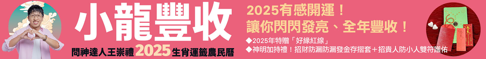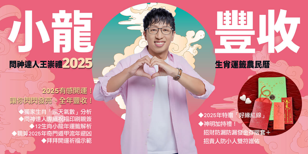 2025有感開運!讓你閃閃發亮、全年豐收!◆獨家60干支生肖「宗天氣數」分析:了解每月氣數高低強弱,增加行事成功率◆2025年特贈「好緣紅線」:特別祈請月老星君加持「好緣紅線」,助人緣、牽姻緣◆神明加持禮!招財防漏、招貴人防小人:「富蛇」招財防漏發金存摺套+雙符護佑◆問神達人專屬祝福印刷親簽:2025年王崇禮老師好緣祝福,祕語收藏◆12生肖小龍年運籤解析:60甲子籤詩+雷雨師100籤,秒懂7大運勢吉凶進退◆親算奇門遁甲流年避凶:分別為每個生肖親算2025年可能出現的車關、口舌、破財、衝突、詐騙、官司、小人、小三等關限日期,在這些日子請儘可能小心謹慎◆拜拜開運祈福示範:送神/除夕/初一求神/安太歲/開工/掃墓/端午/普渡/重陽,拜對求對了,神、靈、人平安一整年 「2025迎青蛇,秋冬五穀豐。」2025年迎來乙巳青蛇年,蛇年又稱「小龍年」。蛇在傳統上被視為智慧與神祕的象徵,人們認為牠能掌握隱祕的知識和力量;蛇也與財富和繁榮有關,古人相信蛇能帶來好運和財富,而有「富蛇」一說;因此,蛇年往往被視為充滿智慧、變革、機會與財運亨通的一年。另一方面,蛇也與謹慎、冷靜有關,提醒我們行事謹慎、切勿貪婪。蛇年既代表智慧和財富,也提醒人們謹慎和內省,《2025問神達人小龍豐收生肖運籤農民曆》陪你應對蛇年可能的變化,讓你運勢旺旺、感情美滿、財運亨通、收獲滿滿!★神明加持好緣紅線+發財金存摺套+雙靈符,神力護佑,招財、保平安、好人緣為了護佑讀者在小龍年財運大發、貴人相助、順利安康,王崇禮老師祈請神明加持招財防漏發財金存摺套,以及添貴人相助靈符、防小人盜賊祝融靈符,此次更特請月老星君賜福加持「好緣紅線」,大家收到後可以戴在手上,也可以放在隨身包、錢包內,或是放在枕頭下,希望能為讀者在新的一年招來好人緣、好姻緣,或是改善人際關係。【好緣紅線,1條】幫助提升人緣、牽姻緣,可以綁手上,也可以放在皮夾、包包隨身攜帶(好緣紅線裝在紅色紙袋中,可以直接連著紙袋收在錢包或包包暗袋中,比較不擔心弄丟、找不到)。【引錢發財金,1枚】發財金放在2025年的新存摺套裡,利用發財金錢母鎮守,把錢財引進來。【防漏財存摺套,1個】印有神符及五路財神送財符,除了幫你把錢賺進來,還要助你守住財。【添貴人相助靈符,1張】祈求工作貴人來提攜、財富貴人迎富貴、姻緣貴人招桃花。【防小人盜賊祝融靈符,1張】預防因為小人、盜賊、祝融而起的事業、財運、健康、學業、感情不順,除了隨身攜帶,最合適貼於居家、公司、店鋪的大門外,建議貼在門口春聯的空白處,低調防小人、防盜賊、防祝融。★獨家「60干支生肖12個月宗天氣數分析」,精準掌握進退時機,提升成功率 小龍年特別新增獨一無二的「60干支生肖12個月宗天氣數具體分析」,獨家公開不同生肖在乙巳年每個月的氣數。 王崇禮老師這次特別為讀者親算每個生肖的氣數強弱高低,運籤代表的是一個生肖的平均整體狀況,但同一生肖不同年分出生,例如屬鼠的人就分甲子鼠、丙子鼠、戊子鼠、庚子鼠和壬子鼠,他們的運勢和氣數不會完全相同,而「宗天氣數具體分析」將能「更精準」地讓不同年分的不同生肖,各自知道自己每個月該進或該退,該衝刺或該保守與觀望。★2025「專屬祝福」,問神達人特別題字與每一位購書讀者「結好緣」 為替大家在新的一年裡注入不一樣的能量,王崇禮老師提筆為大家寫下小龍年的祝福語──「良緣隨身 善緣滿滿」,希望大家在乙巳小龍年裡,不論是與家人、朋友、同事、同學、另一半、甚至是萍水相逢之人等等,都能豐收友善、融洽或美好的關係!★上、下半年「7大運勢」籤詩,神明叮嚀吉凶關鍵,帶你趨福避禍 運勢不會永遠處於巔峰,也不會一直低迷,但要在一年的起伏中趨吉避凶,除了智慧與正確心態,神明慈賜運籤,問神達人精準解籤,傳授你我小龍年的處事原則、吉凶關鍵,輔助12生肖事業、感情、荷包、學業、健康、求子7大運勢平安、豐收!【鼠】上半年凡事「勿急」;下半年小心「謠言」。【牛】上半年保持「謙虛」;下半年「勿沖昏頭」。【虎】上半年「立春」轉運;下半年「冬至」轉亮。【兔】上半年時機「春」至;下半年「守好成果」。【龍】上半年「謹言慎行」;下半年凡事「保守」。【蛇】上半年「福報庇蔭」;下半年「十一月」衝。【馬】上半年「扭轉乾坤」;下半年「吉凶參半」。【羊】上半年「謹慎人事」;下半年「否極泰來」。【猴】上半年「重建信心」;下半年「撥雲見日」。【雞】上半年「神明暗助」;下半年「臂助難求」。【狗】上半年「元宵佳音」;下半年「靜待伯樂」。【豬】上半年「雙喜臨門」;下半年「名利雙收」。★問神達人親算「奇門遁甲」,提醒12生肖避開流年凶險,保命護身12生肖運籤詩主要是「宏觀大方向」,王崇禮老師還親自運用「奇門遁甲」排盤,指點運勢中的「微觀細節」,為「每一個生肖」算出2025年需留意小心的事件及日期,收錄在每個生肖運籤解析之後,讓讀者盡可能避開可能會發生的車關風險、口舌紛爭、破財危機、肢體衝突、小人詐騙、官司困境或職場小人等不必要的麻煩──在這些特別點出的時間點裡,請大家盡可能謹慎行事。★吉日速查求好開始;拜拜祈福+補運儀式不藏私示範,整年都平安跳脫傳統農民曆深奧的內容,以淺顯易懂的方式