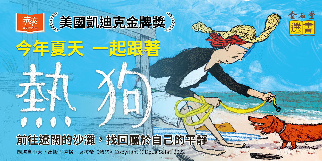 ★2023美國凱迪克金牌獎★ 在盛夏的大城市裡,難以喘息的擁擠總是讓人感到煩躁且沉悶。 一起跟著臘腸狗,出發前往一望無際的沙灘,享受舒服的海風吧! 在那裡,你可以盡情奔跑,大口呼吸…… ▍道格.薩拉蒂的首部自寫自畫繪本,獲得美國凱迪克金牌獎、季茲兒童文學獎插畫家獎、《出版人週刊》年度最佳繪本等多項大獎肯定。 ▍道格.薩拉蒂以流暢的圖像和詩意的文字,將城市生活的緊張與忙碌立體化,並且對比大自然的寧靜與平和,帶讀者逃離煩囂,重新發現生活中的小確幸。 ▍一個關於狗和主人之間情誼與愛的暖心故事,疼愛小狗的主人同理了小狗的感受,帶牠來一場說走就走的小旅行,大海、沙灘、新鮮空氣……為他們找回平靜和喜悅,療癒了身心。 在你覺得又煩又熱、受夠了一切的時候, 或許,你需要的只是綿長的沙灘和遼闊的天空, 帶你找回原本的自己。 小狗跟著主人出門辦事,從郵局、洗衣店到眼鏡行,一路上走走停停,但城市的夏天就像火爐一樣炎熱,熱騰騰的人行道、轟隆作響的施工噪音、刺耳的喇叭聲,還有擁擠的人群……好熱、好吵、好煩,小狗再也受不了了,就這樣癱坐在斑馬線的正中央!幸好,貼心的主人同理了牠的感受,帶牠跳上計程車,坐上火車、渡輪,來到空曠的小島。遼闊的天空、湛藍的大海、綿長的沙灘、舒服的海風……在這裡,小狗可以盡情的奔跑、嬉戲!而主人因此偷得浮生半日閒,陪著小狗一起度過美好的時光。等到太陽下山,夜幕低垂,他們愉悅又滿足的踏上回程,重返冷靜下來的城市,回到熟悉的日常和溫暖的家。 這本榮獲美國凱迪克金牌獎的繪本,是道格.薩拉蒂第一次自寫自畫的作品,他將自己居住在大城市的體驗和感受,轉化成這個節奏明快又生動的故事。他以鉛筆和不透明水彩結合電腦繪圖描繪,用色彩和構圖的變化做對比和轉換,故事前半以炙熱的橙色調配上縱向的黑線框格,表現出城市的酷熱、擁擠和緊張,鏡頭轉往海邊之後,則以清涼的藍綠色調加上橫向無框的分格和跨頁呈現,猶如一部紙上動畫短片,開展了讀者的視野與心境。 以「熱狗」(HOT DOG)當作書名,十分巧妙,主角小小的紅色臘腸狗在外觀上真的很像熱狗,而「熱」不僅僅只是盛夏的高溫,也象徵著喧鬧忙亂的生活環境,以及各種壓力的來源。身處其中,每個人或多或少都會和故事中的臘腸狗一樣,感到無奈、迷失而茫然,或許這時候,我們需要的只是一處屬於自己的沙灘、樹林或天空,就能重新充電,找回內心的寧靜和平衡。