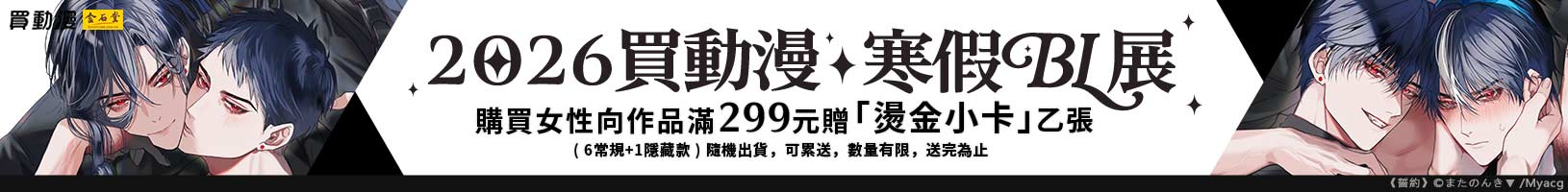 25寒假漫博買動漫-買動漫女性向作品購滿299元送「女性向燙金小卡(7款隨機)」乙張,單筆訂單最多累送5次,數量有限送完