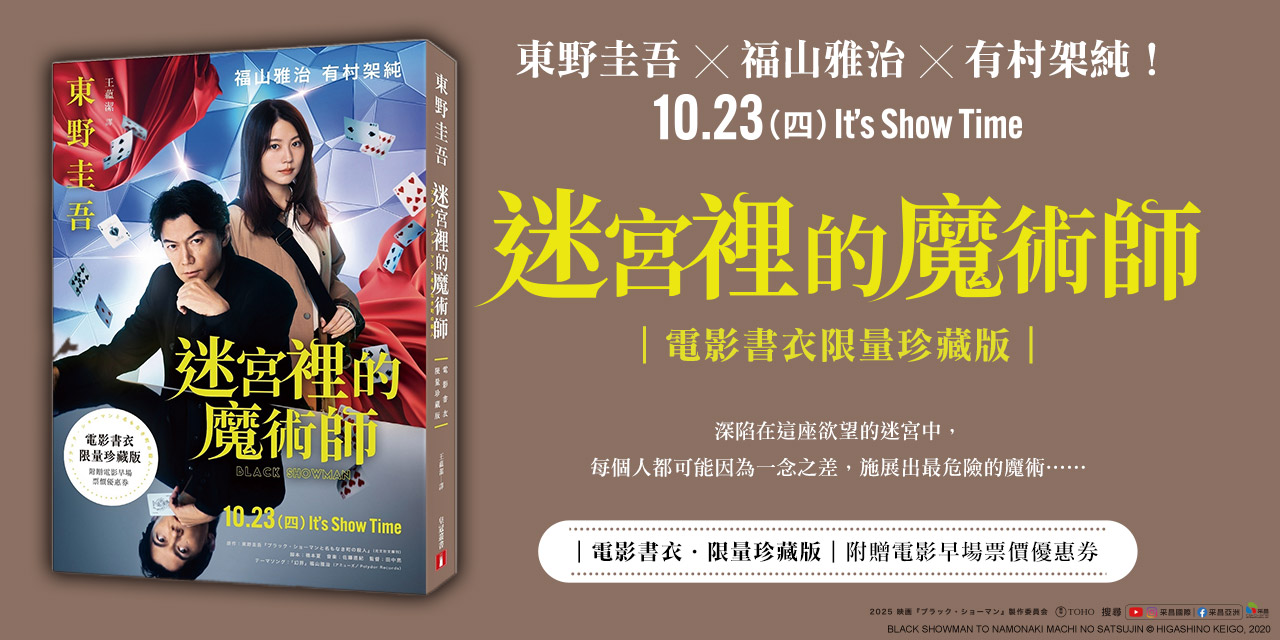 內容簡介: 電影書衣限量珍藏版 隨書附贈電影早場票價優惠券 福山雅治、有村架純 領銜主演! 10/23 It’s Show Time! 深陷在這座欲望的迷宮中, 每個人都可能因為一念之差, 施展出最危險的魔術…… ❈ ❈ ❈ 每一個幽微曲折,都要帶你抵達最深邃的黑暗。 每一次呼吸眨眼,愛與欲望,恨與殺意,夢與失落, 都將神不知鬼不覺地,幻化變形…… 這一年冬天,一切都變了樣。不光是這個城鎮,整個日本,不,整個世界都完全變了樣。 剛接受男友求婚的真世怎麼也沒想到,她會在疫情蔓延的當口「回家」。等待著她的,是父親神尾英一冰冷的遺體。那個深受愛戴的退休老師,幾乎把他的一生都奉獻給學生,如今竟然慘遭殺害。沒有徵兆,沒有嫌疑犯,沒有可信的證據,真世無法接受,她的父親已經離她遠去。 等待著真世的,還有那場同學會。當年他們一起受教於英一,一起度過最青澀的少年時光。如今那班同學已在各行各業出人頭地,從銀行員到酒舖師傅,從企業老闆到當紅漫畫《幻迷》的作者。當他們再度重聚,一項名為「幻迷屋」的觀光振興計畫,也成為這個破落小鎮眾所矚目的焦點。 就在此時,一名神秘男子驟然降臨,他破壞命案現場,聲稱自己是英一的弟弟。檢警對他頭痛萬分,但只有真世明白,這就是她的叔叔,人稱「黑色魔術師」神尾武史的一貫作風。 魔術師的算計很精密,魔術師的技法很華麗,魔術師的雙眼早已洞悉,那個殺害神尾英一的兇手,就隱藏在這群人裡。而真世絲毫未覺,她就要墜入一場名利與欲望交織的魔術戲法中…… ❈ ❈ ❈ 只要能解開謎團,不管用什麼方法都無所謂! 東野圭吾以新冠肺炎疫情為背景,全新寫就「黑色魔術師」系列,相對於湯川學的優雅冷靜,加賀恭一郎的義理人情,「神尾武史」堪稱足以總結他筆下所有主角原型的代表人物。他聰明絕頂、玩世不恭,所有秩序都要為他傾倒,所有原則都要為他讓路。他用魔術來破解謎團,但最大的謎團卻往往來自每一顆愛欲逢魔的心。《迷宮裡的魔術師》將成為神尾武史最華麗的初登場,而它展現的不僅是一場「推理的魔術」,更是一場「人性的魔術」! ❈ ❈ ❈ 各界名家一致盛讚! 【作家】陳曉唯 專文導讀 【作家】文善 【魔術師】陳日昇 【作家】陳栢青 【英國與加拿大犯罪作家協會PA會員】提子墨 盛讚推薦! ●依姓名筆畫序排列