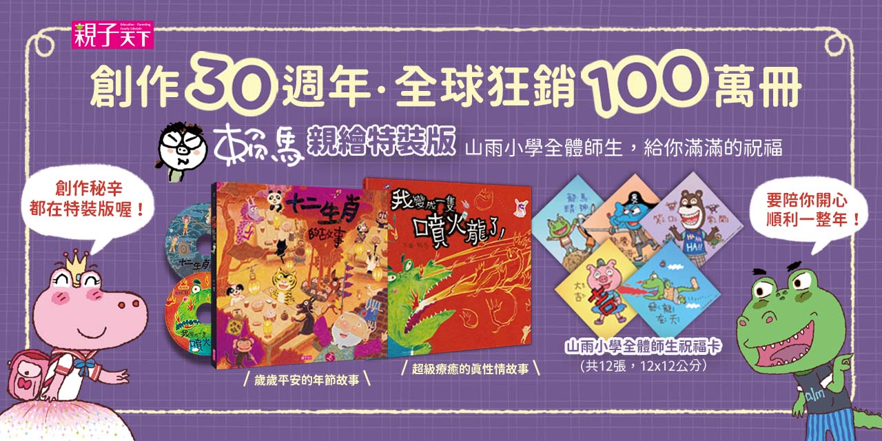 賴馬經典繪本《十二生肖的故事》+《我變成一隻噴火龍了!》攜手登場! >>>以幽默風趣的口吻,穿越時空、現場報導「12 生肖」不為人知的祕密 >>>以古怪詼諧的筆法,貼身觀察「噴火龍」高潮迭起的命運 讓每個孩子在新的一年,不只長知識、長智慧,還長出情緒大能力! 最有氣氛的「賴馬龍年親繪祝福特裝版」來了! Q:這是什麼? A:最引人入勝的民間傳說《十二生肖的故事》(歲歲平安、大吉大利的年節故事) +最能引起共鳴的噴火龍阿古力(超級療癒、超級降火氣的真性情故事) 最重要的是,有賴馬老師親自揮毫,為每位大小讀者獻上「山雨小學師生祝福卡」12張— 讓大小讀者每一年、每個月,都有最真摯的祝福相陪! 還有其他問題嗎?接下來進入猜謎時間,歡迎來挑戰! (答案全部都在好看的繪本裡!) Q1:十二生肖是怎麼來的?為什麼是這十二種動物呢? Q2:噴火龍阿古力為什麼會噴火?(提示:嗡嗡嗡,飛到西又飛到東) Q3:十二生肖的第一名是誰?是用什麼戰略奪冠?(提示:貓咪的宿敵) Q4:噴火龍的火燒到了幾棵樹?幾間房子?(提示:要認真數喔!) Q5:十二生肖的競賽中,龍為什麼遲到了呢? Q6:阿古力的噴火病,最後怎麼治好的? Q7:賴馬老師出現在這兩本書的哪些地方? 「山雨小學師生祝福卡」帶給大家一整年的祝福! 使用說明: 1. 貼在家裡祝福自己 2. 寫卡片送給家人朋友 3. 當作角色卡收藏永恆的祝福 (單張尺寸:12x12cm) 噴火龍阿古力的祝福:「飛龍在天」、「風風火火」、「風生水起」 阿古力+班傑明的祝福:「龍馬精神」 愛哭公主+朱瑞福的祝福:「步步高升」 生氣王子的祝福:「龍騰四海」 朱瑞福的祝福:「長長久久」 小珍珠的祝福:「諸事大吉」 大熊老師的祝福:「笑口常開」 瘋狂科學家:「好運旺來」 樹懶小姐:「財源廣進」 羅送湯主廚:「年年有餘」 【單書內容介紹】 >>>關於《十二生肖的故事》(書+故事CD) 如果老人家記不清楚自己幾歲,該怎麼辦呢? 數一數十二生肖就對了! 那麼,你知道十二生肖是怎麼來的嗎? 原來是玉皇大帝舉辦了一場動物比賽, 打算選出12種動物當作生肖,來幫忙大家記住年齡。 可是,為什麼比完賽後老鼠卻會怕貓? 原本有腳的蛇,後來卻沒了腳? 猴子變成了紅屁股? 這些為什麼啊為什麼 就讓賴馬叔叔來為你解答吧! 最富年味、華人世界必讀經典, 賴式幽默為你呈現最莞爾的十二生肖故事! >>>關於《我變成一隻噴火龍了!》(書+故事CD) 噴火龍~轟!的上演孩子的內心戲! 嗡嗡嗡,蚊子波泰來了, 波泰最喜歡吸愛生氣人的血, 只要被叮上,就會立刻染上「噴火病」, 古怪國的阿古力很愛生氣,是波泰的第一選擇。 噴火不是病,噴起來卻要人命! 拚命噴火的阿古力,會遭遇什麼樣的麻煩? 據說破解噴火魔咒的方法只有一個……