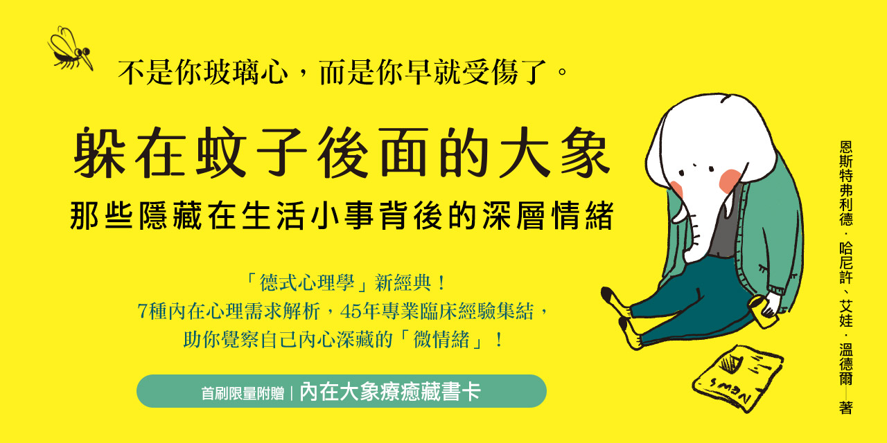 不是你玻璃心, 而是你早就受傷了。 「德式心理學」新經典! 7種內在心理需求解析,45年專業臨床經驗集結, 助你覺察自己內心深藏的「微情緒」! 台灣版特別附贈 Dinner Illustration精心繪製, 7款「內在大象療癒藏書卡」! 極具珍藏價值! 他人眼中的蚊子:不過就是襪子沒收好,為什麼你要這麼生氣? 你內心裡的大象:維持整潔是我的日常,你若重視我,就不會破壞它。 他人眼中的蚊子:鄰居吵到你,為什麼不直接跟他們抗議? 你內心裡的大象:爭執是「危險」的訊號,有可能會傷害我。 他人眼中的蚊子:他們不找你幫忙不是很好嗎?省得麻煩。 你內心裡的大象:我是不是不受歡迎、不再被需要了? 看起來像「蚊子」一樣小的事,背後的情緒卻有如「大象」一樣大。 每個情緒背後都有成因,通常我們會知道自己為什麼沮喪,為什麼生氣?但有時候,一些他人看起來無關緊要的小事,卻有如蚊子尖銳的口器,刺進了我們心靈深處,讓我們大發雷霆,甚至沮喪悲傷,而我們自己也不知道原因。 這些「小事」可能是一個沒有回覆的訊息、工作時突如其來的手機鈴聲,也可能是餐廳差勁的服務、朋友無心的一句話。它反映了我們過往的人生履歷、潛在的自我認同、深藏的內在創傷,我們很容易不自覺的迴避它,但無意間卻忽視了自己最真實的情感需求,陷入低落的情緒中。 德國心理學家哈尼許和溫德爾融合45年臨床經驗、實際案例解析,幫助我們傾聽真實的心聲、認清自己的需求、壯大內心的力量,透過自主練習的過程,我們得以從情緒中找到勇氣,找到突破僵局的方法。每個人都有屬於自己的蚊子和大象,而經過這場療癒之旅,大象將會走出蚊子的背後,找回屬於自己的平靜。