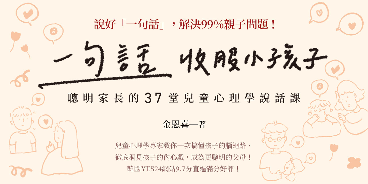 說好「一句話」, 解決99%親子問題! 兒童心理學專家教你一次搞懂孩子的腦迴路、 徹底洞見孩子的內心戲,成為更聰明的父母! 韓國YES24網站9.7分直逼滿分好評! ‧當孩子口出惡言,反應激烈時…… 「在這個家裡,就算再不高興也不准亂發脾氣!」(X) 「你看起來好像遇到了什麼不開心的事,你還好嗎?」(○) 兒童心理學專家說:讓孩子知道你願意聽他訴苦、陪他共感。說對一句話,就能與孩子心靈相通。 ‧當孩子嚎啕大哭,什麼都聽不進去時…… 「我不是說過了嗎?不要哭鬧,好好把話說清楚!」(X) 「先冷靜下來,告訴我你在想什麼,我會聽你慢慢說。」(○) 兒童心理學專家說:父母的耐心會成為孩子情緒管理的榜樣。說對一句話,就能培養孩子的高EQ。 各種崩潰惱人的育兒現場,身為父母的你必定都遇過,然而每一次「危機」其實也都代表新的轉機,想要改變教養困境,關鍵就在「說對一句話」。 擁有二十年資深諮商經驗的兒童心理學專家金恩喜認為,父母常會無視孩子的感受,只說自己想說的話,因而在不知不覺中用言語傷害了孩子,讓關係產生裂痕。只有先理解孩子的心理需求,再以情緒引導的方式給予回應,才可能開啟親子關係的正向循環。 這本書從心理學專業理論出發,並提供大量案例、具體方法與執行訣竅,教你如何培養孩子的高自尊、形塑社會化人格與解決問題的必備能力。藉由37堂「保證有用」的兒童心理學說話課,你也能拋棄無效教養、避開親子溝通的誤區,一句話收服孩子的心。