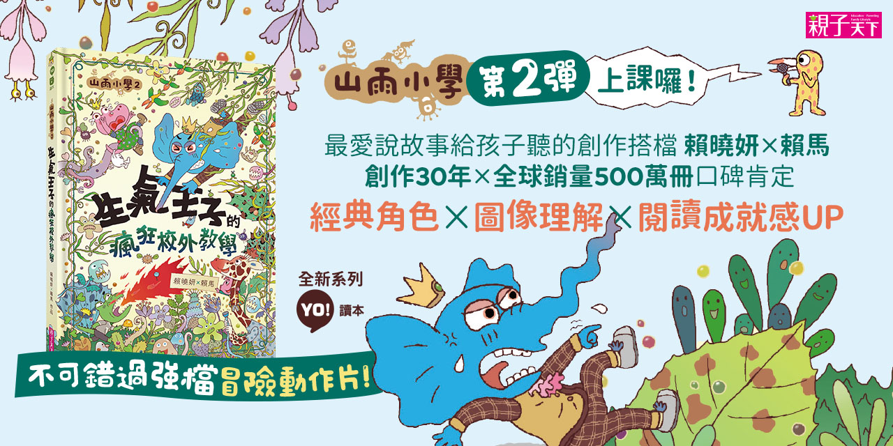 最愛說故事給孩子聽的創作雙人組 賴曉妍x賴馬 聯手推出創意圖像讀本「山雨小學」系列打破制式學習框架,讓每個與眾不同的孩子,跟著經典繪本角色快樂上學去!歡迎小朋友和生氣王子一起大冒險,提升情緒力、知識力、圖文閱讀理解力!兒童文學作家 林世仁、顏志豪 歡樂推薦 ★☆★山雨小學招生中★☆★你是哪一種小朋友?特別愛哭的、特別愛生氣的、特別會噴火的、特別會游泳的、特別會讀書的、特別乖的,還是特別古怪的?這裡歡迎每一個「特別」的孩子,校長說了,有哪個孩子不是特別的呢?!ALL are welcome! 「山雨小學」系列特色:1. 經典繪本角色攜手共創新故事--愛哭公主+生氣王子+噴火龍阿古力大集合!2. 不一樣的學校,擁抱多元價值--在這裡,什麼學生/老師都有!發生什麼事都不奇怪!3. 結合最新閱讀趨勢,不只讀文字,也讀圖像,全面提升閱讀理解力4. 融合SEL(Social and Emotional Learning, 社會情緒學習)理念,跟角色一起培養各種情緒力 當生氣王子遇上瘋狂植物,究竟誰輸誰贏?!艾迪王子是個一板一眼的模範生,每天在固定的時間做固定的事,生活只要有一丁點不如意就會火冒三丈、氣得鼻子打結,沒想到他陰錯陽差跟著山雨小學的學生來到了瘋狂植物園,與大家一起探險、逃亡、解謎。他該如何逃離各種植物怪獸的追趕?王子的理性和感性,是否能在關鍵時刻發揮作用? 關於內容=>結合社會情緒學習(SEL, Social and Emotional Learning)• 看生氣王子學會「自我管理」—當他不再是眾人的目光焦點時,生氣好像也沒有用?!• 看生氣王子學會「社會覺察」—當植物發狂時,很難不注意到它們的「心情」• 看生氣王子學著跟其他同學互動、表達內心感受,即「溝通技巧」—小珍珠手寫卡片表達感謝 關於形式=>結合最新閱讀趨勢,安排多重圖文敘事●多元類型的敘事:驚險懸疑動作片內容+故事圖解+分格漫畫=>培養圖文閱讀理解力●PLUS遊戲:跟著角色一起找找看=>練習觀察力●PLUS知識:艾迪王子小知識(認識火車、名人等)=>提升知識力 「山雨小學」QA時間:Q1:要進入這所學校有什麼必要條件?A:山雨小學是古怪國國王特許的實驗學校,起初學生以古怪國當地的孩子為主,後來因為招生不足,所以後來漸漸變成只要有點古怪的孩子都能申請入學。 Q2:什麼樣的學生才能入學?A:古怪國的學校,當然要特別的學生才收啊!可以是特別愛哭的、特別愛生氣的、特別會噴火的、特別會游泳的、特別會讀書的⋯⋯連特別乖的小珍珠都是山雨小學的學生喔!這樣看來,有誰是不特別的呢? Q3:學校有哪些老師?A:第一集登場的有數學老師樹懶小姐、健康課兼自然課的大熊老師和游泳課老師山豬教練。預告下一集會有一位超厲害的重量級老師來到山雨小學! Q4:學校提供哪些課程?A:課程大多是為了適應古怪的環境而設計,但真正上課狀態很有彈性,像是山雨來襲的時候,就會立刻變成緊急避難訓練課,泳池到達滿水位時,會改上臨時游泳課,所以學生每天都要帶著泳衣泳褲。 Q5:一年要上學幾天?A:不一定。去年上了一百五十八天課,但前年因為老師不約而同都請假去環遊三國,所以只上了六十二天課。最高紀錄是四百一十三天,最低紀錄是十五天。 Q6:班上有幾個同學?A:看書裡的插圖數一數最準確了。但是有時候會多幾個或少幾個,不保證每天都一樣,也不保證學生每天都能走對教室喔! Q7:早上幾點要上學?A:三國(古怪國、百香國、奇異國)標準時間的九點是早上的第一堂課。 Q8:有沒有制服日?A:山雨小學目前沒有制服,因為古怪國的居民有著各式各樣的外型,要客製多種版型難度太高。但因為愛哭公主就讀山雨小學的因素,百香國皇后已派出技術高超的皇家裁縫師為山雨小學著手設計制服。 Q9:什麼時候放假?A:經常會發生不能上課的狀況,但沒有一般認知上的假期。 Q10:有沒有校車?都是誰在坐?A:除了校車,山雨小學更常使用的其實是「校船」。校車通常用於校外教學,沒有校外教學時,也會幫忙接送附近需要坐船的居民。 Q11:去哪裡戶外教學?A:豐富的校外教學活動,是山雨小學的特色。各種精采的校外教學奇遇記,請鎖定「山雨小學」系列故事! Q12:一定要畢業嗎?A:如果不想畢業,山雨小學很歡迎學生繼續學習,直到學生覺得自己準備好了再畢業。但沒有學會游泳是不能畢業的,因為隨時會有山雨洪水,這是學校的堅持。 Q13:創校宗旨?A:為童話世界培育出堂堂正正古古怪怪的好孩子。