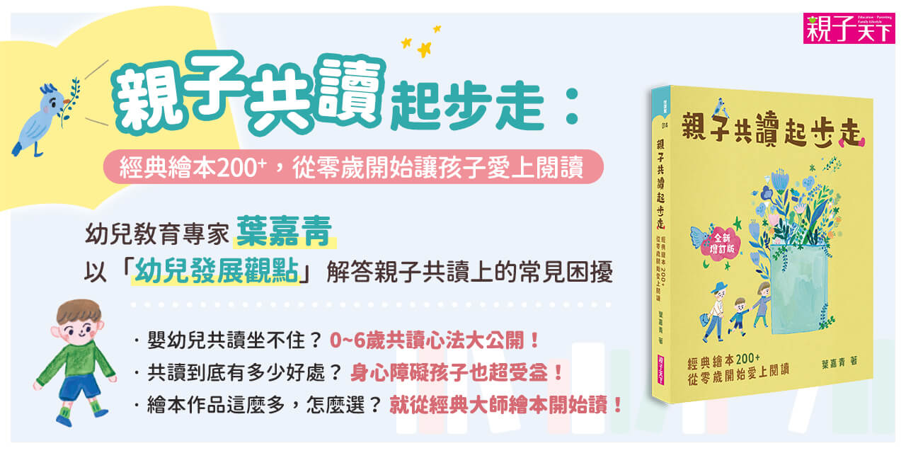 幼兒教育專家&學前閱讀推廣人葉嘉青親自帶路,從閱讀胎教⮕0~3歲寶寶⮕3~6歲幼兒,適齡適性的早期閱讀指引 & 200+繪本的深度賞析運用,讓你與孩子在親子共讀的道路上,一起享受閱讀繪本的樂趣! 親子共讀,從孕期就能開始?有哪些步驟與策略,可以幫助大人在茫茫書海中挑出適合幼兒的繪本?我花好多時間準備共讀,但寶貝才聽沒幾分鐘就不耐煩,這是怎麼回事?孩子總是要求我念同一本繪本,這是正常的嗎?從懷孕期間到幼小銜接,有什麼各階段共讀必須留意的策略與技巧?針對特殊需求孩子,可以尋找哪些資源?希望從經典繪本中帶領孩子進入美好閱讀世界,能從哪些大師的作品起步? 身為幼兒照顧者、陪伴者或教育教養者的你,是否也有著上述類似的棘手困擾?就讓多年來串連醫療、幼教與公益,推廣幼兒閱讀超過25年的嘉青老師,從「分齡閱讀」到「多元閱讀」,橫跨「認知能力」與「非認知能力」領域,以幼兒發展為切點,將生澀學術研究轉化為第一線親師能立即上手的務實方法,陪伴你踏入美好的親子共讀之旅! 長年來持續受邀擔任眾多童書獎項評審與策展工作,也以譯者身分,將國外優質繪本引介到國內的嘉青老師,是國內推動學前閱讀的重要推手。外探各國繪本發展趨勢之餘,近年更與公部門攜手,將聯合國永續發展指標向下扎根,不僅透過繪本連結SDGs概念,在幼兒心中種下「環境永續、世界共好」的火苗,也特別注意到到視障、聽障等特殊族群孩子需求,在書中引介兼具文字與點字的「雙視繪本」、有聲書繪本和手語電子繪本,期待幫助特殊孩子找到適合自己的閱讀模式,開啟探索世界的大門。 嘉青老師信手拈來,一本又一本,示範如何將繪本運用於親子互動中: ◎當拿到沒有文字只有圖像的繪本《7號夢工廠》《一朵小雲》時,大人如何引導孩子說出無字書裡面的「畫中有話」?◎當孩子情緒詞彙缺乏,不斷吶喊「我好生氣、你好討厭」時,《菲力的17種情緒》如何讓孩子學習區辨自身感受,了解自己到底是怎麼了?◎當面對努力成果不如預期、內心沮喪的孩子,我們可以如何運用《短耳兔》系列故事,隨著主角與情節支持孩子的自信與正向行為? 在《親子共讀起步走:經典繪本200+,從零歲開始讓孩子愛上閱讀》中,嘉青老師搜羅包含本土原創與美、英、日、波蘭等各國精彩繪本超過200本,不僅涵蓋了不同年齡階段與銜接期的共讀素材與技巧,在「共讀小診間」單元,還彙整親師共讀時最常詢問的疑難雜症為你解惑,更安排超過20個延伸閱讀活動、學習單,幫助孩子體會閱讀的多元與豐富。 誠如嘉青老師所說:「引領孩子進入繪本的世界,就像領航者手把手的帶著孩子進入多元且千變萬化的佳美之地。一旦孩子找到了悠遊書海的方法與體會到探索其間的美好,將會主動且持續的沉浸在閱讀的習慣中而終身受益。」 把孩子抱在膝上,從依偎著共翻一本書的美好,到讓孩子自己拿起繪本樂在其中,就從《親子共讀起步走》這本書開始,串連你與孩子最美好的家庭記憶! ~~本書所有版稅捐贈台灣世界展望會~~ ★本書亮點★★根據幼兒發展階段,循序漸進、分齡推薦適合共讀的國內外經典繪本依照孩子的心智與能力發展,兼顧認知與非認知能力的成長需求。★以繪本為原點,多元題材 × 寓教於樂 × 啟發思考的親子互動,輕鬆上手22個延伸閱讀與活動學習單,引導孩子提問與互動,讓親子共讀成為累積情感連結的養分。★穿插「閱讀小診間」單元,解答親子共讀的疑難雜症傳授多年推展共讀心法與祕訣,為父母師長最常碰到的共讀卡關點解惑。★結合聯合國17項永續發展目標(SDGs),讓繪本成為討論世界共好的最佳媒材回應全球都關注的永續議題。透過繪本在孩子心中種下讓世界更美好的想望。★深度賞析6位世界繪本大師,在孩子心中撒下文學種子精選美、英、日、波蘭等國際大師作品,引領孩子進入繪本文學殿堂。