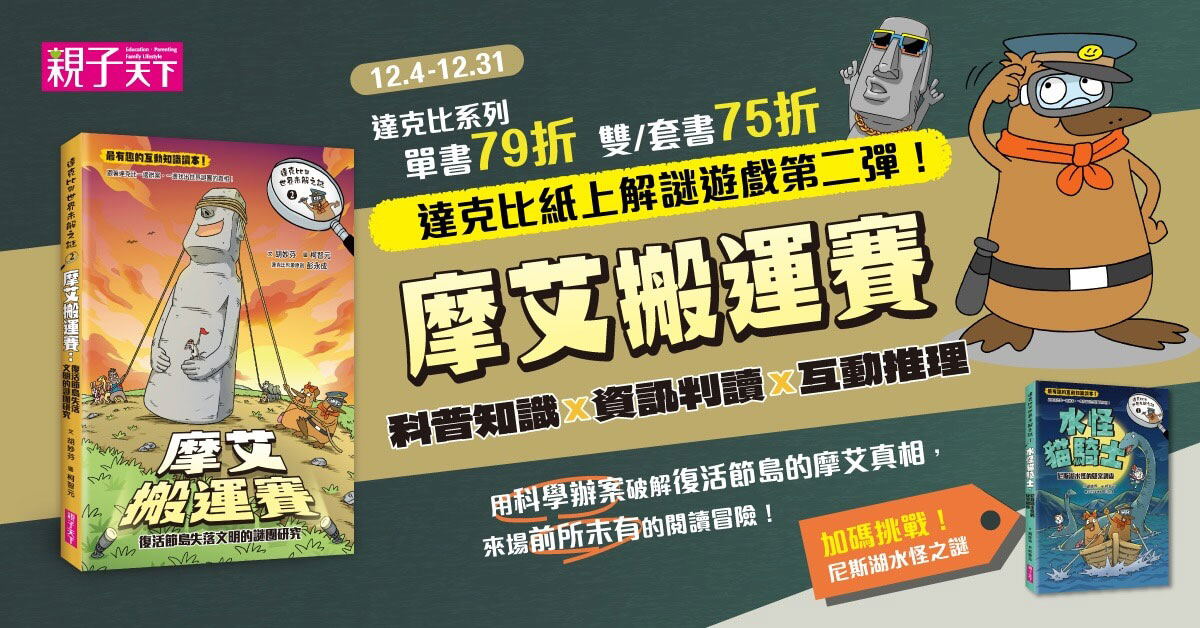 小學生最愛的科普知識漫畫系列【達克比辦案】隆重推出特別篇「世界未解之謎」第二彈!☆★ 紙上實境解謎 ╳ 互動式知識閱讀 ★☆培養科學邏輯思考,習得資訊判讀力▻►▻ 一同揭開復活節島上失落文明的神祕面紗 ◅◄◅在遙遠的復活節島上,遍布近千尊重達數噸的摩艾巨石像,連當地居民都不知古拉帕努伊人是如何把祂們移到海邊和山上。為了解開這個謎團,主辦單位決定舉辦一場挑戰賽,讓參賽隊伍重現古代搬運法!然而,一封來自自稱為守護者的恐嚇信卻在比賽前夕寄達,痛罵比賽根本在侮辱傳統文化,揚言若不取消比賽,恐有意外,後果自負……心急如焚的主辦單位只好請達克比擔任評審,阻止破壞並維護比賽順利進行!而如今,僅能從五組參賽隊伍中蒐集情報: ◆ 河狸伐木總工會→河狸理事長 ◆ 大力士搬家公司→錢鼠老闆 ◆ 馬那靈力召喚者→獅子神棍 ◆ 摩艾考古志工隊→大鬍子教授二人組 ◆ 超犀利起重團隊→工程師犀哥這一回,邀請你擔任達克比的助手,運用科學辦案的精神,從不同參賽隊伍中找出破案線索,學習判讀與驗證線索的真偽。快跟著達克比一起抽絲剝繭,在偵破案件的同時,也揭開摩艾石像如何移動的世紀大謎團吧!◎系列特色1. 互動式閱讀,運用科學探究步驟一步步來實際參與,成為辦案高手。2. 提供反覆試驗途徑,重複嘗試錯誤,增進邏輯思考力與資訊判讀力。3. 每條路線蘊含破案關鍵物證,任何細節不可放過,提升閱讀敏感度。◎本書關鍵字:解謎、互動閱讀、摩艾石像、復活節島、世界未解之謎、科學探究、科學邏輯、資訊判讀◎無注音,9歲以上適讀◎學習領域分類:自然,十九項議題:資訊