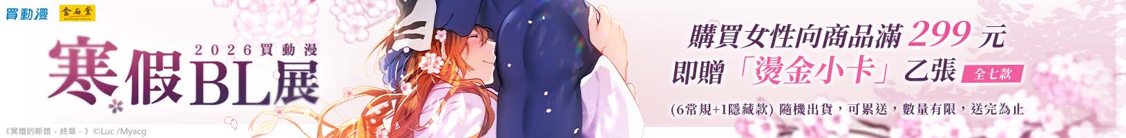 12/31-3/24 買動漫女性向作品購滿299元送「女性向燙金小卡(7款隨機)」乙張,單筆訂單最多累送5次,數量有限送完為止。