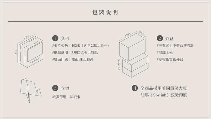 有別於平放式卡片收納,外包裝採上掀盒蓋與文字燙白質感印刷設計,更便於展示、保存與抽取,美好人生就該值得如此珍惜收藏。