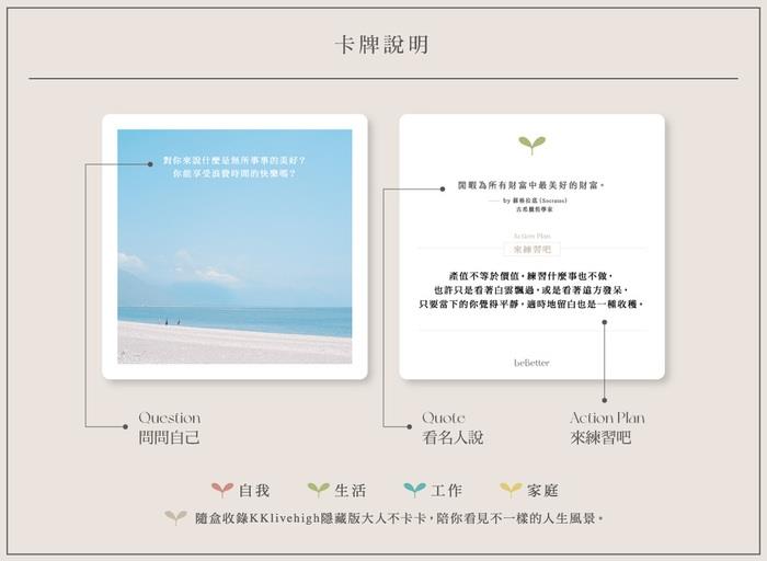 《be Better大人不卡卡》每組包含100 張人生整理套卡+1張《KKlivehigh》隱藏版人生整理套卡+2張使用說明卡,不僅是個與自己對話練習的工具,更可以是居家生活的選物道具,以及妝點風格的攝影寫真,值得你細細品味與收藏。