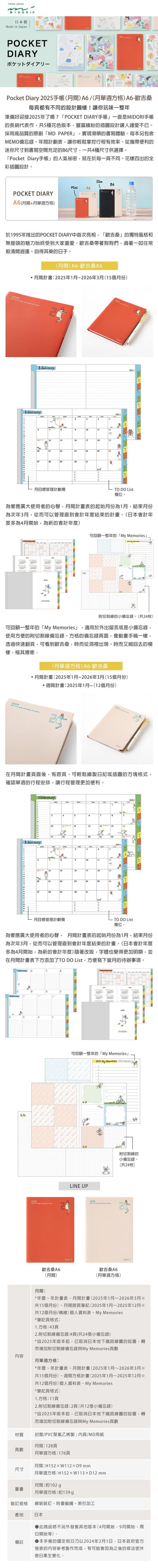 「POCKET DIARY手帳」一直是MIDORI手帳的長銷代表作,總共5種花色版本,豐富繽紛的插圖設計讓人鍾愛不已筆記欄位多,可寫下每天預定計畫及代辦事項這款手帳大小約為明信片大小,方便詳細記錄計畫。每月份的「月計畫頁」其後,增設「跨頁雙週間計畫」頁(右側頁面為筆記空間)。附設便利實用的索引功能。