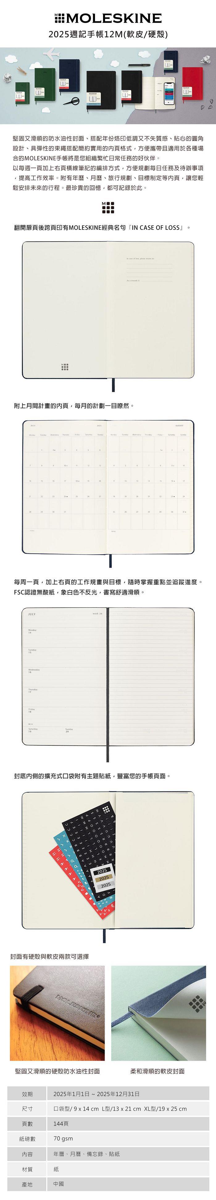 堅固又滑順的防水油性封面、貼心的圓角設計、具彈性的束繩搭配簡約實用的內頁格式,方便攜帶且適用於各種場合的Moleskine手帳將是您組織繁忙日常任務的好伙伴以每週一頁加上右頁橫線筆記的編排方式,方便規劃每日任務及待辦事項,提高工作效率附有年曆、月曆、旅行規劃、目標制定等內頁,讓您輕鬆安排未來的行程。最珍貴的回憶,都可記錄於此