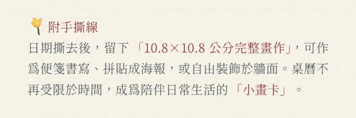 「這次桌曆是用小杯子的方式來呈現,一張張畫出春夏秋冬適合喝的茶,也搭配不同的器皿去分類。希望大家在翻閱的時候,能有一點點小放鬆。這是我很想送給身邊,也在努力生活、工作的朋友的心意。」