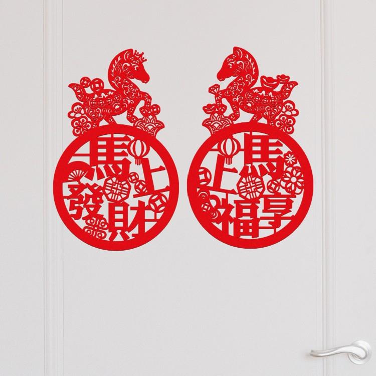 設計上運用元寶、銅錢、鑽石(賺錢)、燈籠(幸福團圓)、窗櫺(財富豐厚)的意象,作為馬圖紋轉化,雕刻於進口美術紙上。春聯一對,包含馬上發財-祝您財富報到、馬上享福-祝您福氣報到,可沾膠黏貼於門前、柱上、辦公桌、櫃子、財位處等。背卡另可用來撰寫(如財 福 春等字)張貼呦。