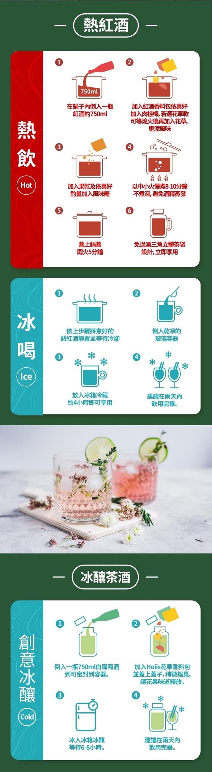 三五好友歡聚時刻,都可以煮上一鍋暖呼呼熱紅酒,暖身暖心再美好不過!HOIIS好集食熱銷第一的熱紅酒香料包,給您幾個不得不購入的理由:每包香料包內含4種天然果乾,無人工添加保留水果原味。獨家採用柑橘與檸檬風味糖,3顆檸檬(柑橘) 才能取1克的風味糖,獨具香氣禮盒包裝 時尚大方,送禮自用兩相宜多元喝法輕鬆上手,加入紅白酒或果汁熱飲,享有不同美味。