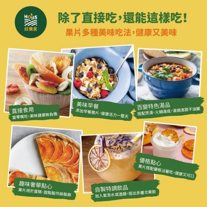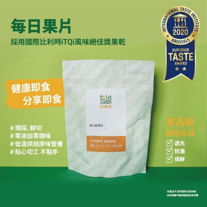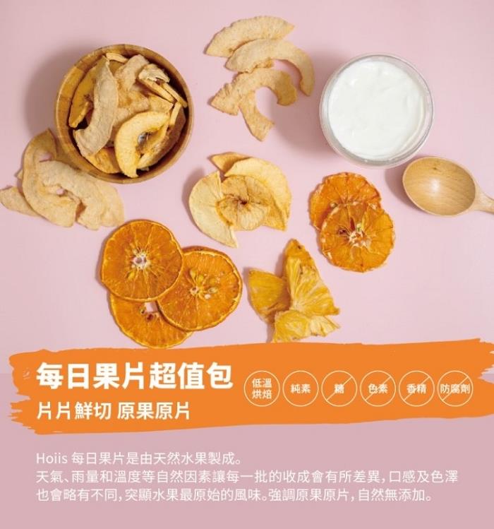 Hoiis每日果片是由天然水果製成,天氣、雨量和溫度等自然因素讓每一批的收成會有所差異,口感及色澤也會略有不同,果片系列的獨特性,保證吃的到真實的自然原味。除了天然,更堅持健康零添加,沒有任何的偽甜,即使果片輕薄,也吃的出滿滿的水果原味。