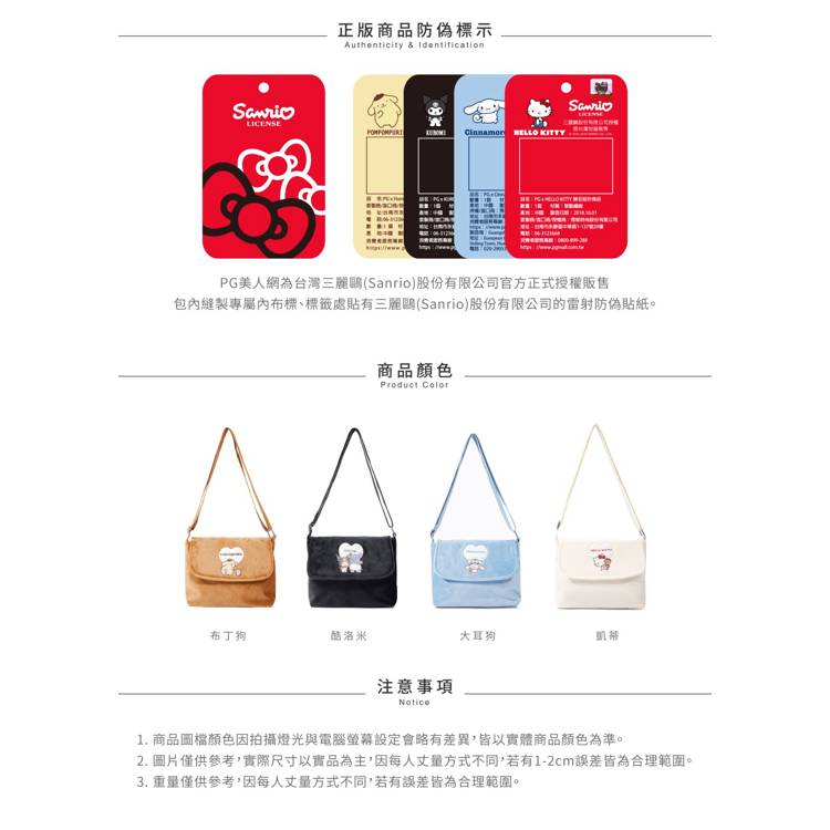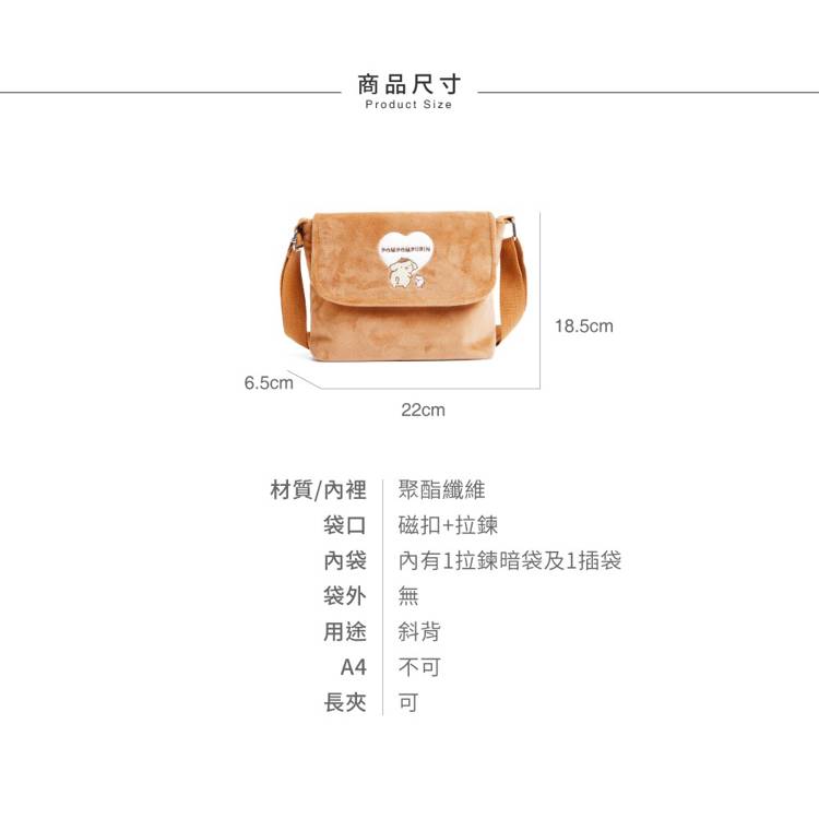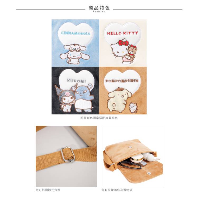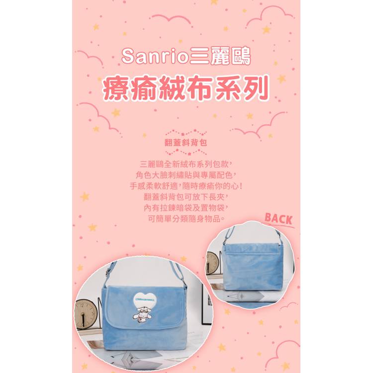三麗鷗全新絨布系列包款,角色大臉刺繡貼與專屬配色,手感柔軟舒適,隨時療瘉你的心!翻蓋斜背包可放下長夾,內有拉鍊暗袋及置物袋,可簡單分類隨身物