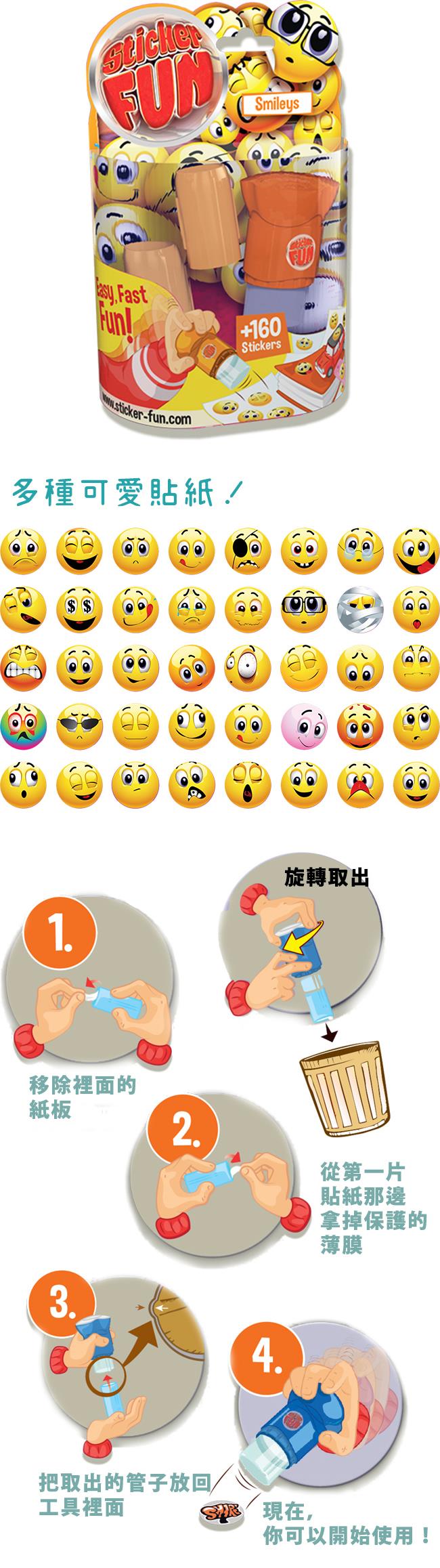 按壓頂端按鈕即可跑出活潑有趣的圓形黃色笑臉重複黏貼紙,一條共有隨機80張貼紙,共有兩條貼紙,發揮創意隨心所貼