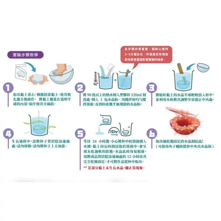- 魔法大變身: 只要照著簡單步驟,加入魔法粉和水,耐心等等等…哇!神奇的水晶就會從無到有,一點一點長大,變成一顆閃閃發光的水晶洞!就像變魔術,超酷的!