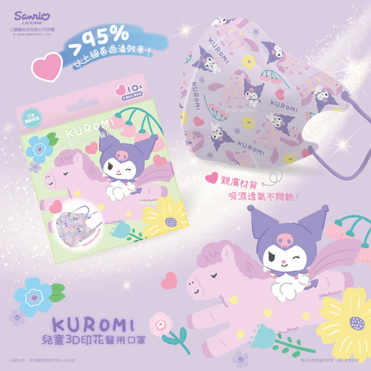 酷洛米甜心馬配色柔和又有個性,3D立體讓呼吸更自在,親膚透氣適合長時間配戴
