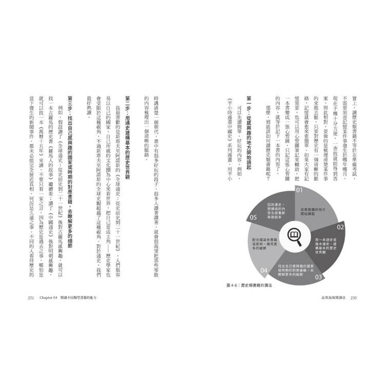 「讀歷史類書籍需要背誦和記憶嗎?」這是很多人從學生時代所留下來的遺毒。事實上,讀歷史類書籍不等於在準備考試,以記憶的方式去讀,只會失去閱讀的樂趣。當然,如果無法記憶對你來說沒有閱讀的扎實感,可以用心智圖筆記來輔助,把一本書變成一張心智圖,只記這張心智圖的內容,就等於記下一本書的內容了。