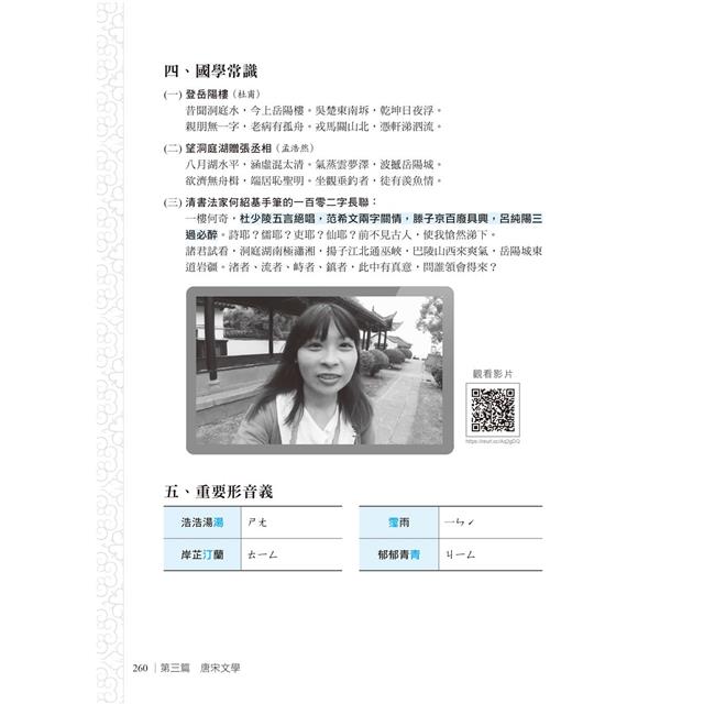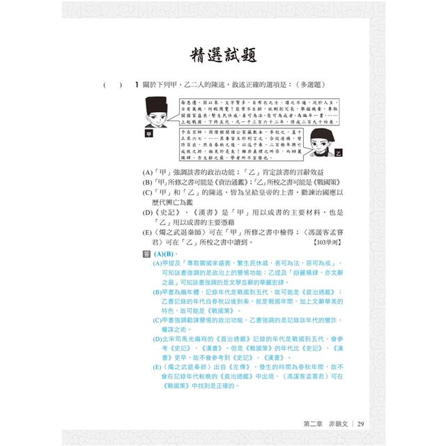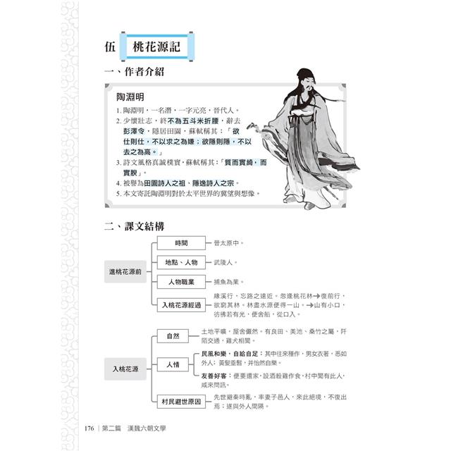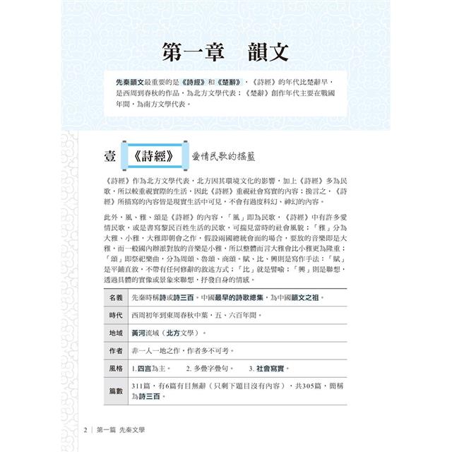 重量級國學與古文這本的內容排版是根據時代來排列,以時間軸為目的,建立大家對於國文的歷史背景,才不容易搞混。每個單元再劃分為國學常識的基本介紹、國學常識延伸出去的閱讀題材、教育部公告的核心古文,最後還會附上該單元的考古題。