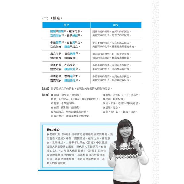 除了國學常識,同時也收入國學常識延伸的閱讀名篇,因為現在的教育趨勢重視閱讀素養,所以在講到《詩經》、唐詩、宋詞這個國學常識時,會延伸收入關於《詩經》、唐詩、宋詞的名篇,並附上閱讀注釋和翻譯,讓你輕鬆瞭解文義。所以這本書不只有國學常識,也由國學延伸大量的閱讀名篇讓你閱讀,可以增進自己的閱讀速度和語感。
