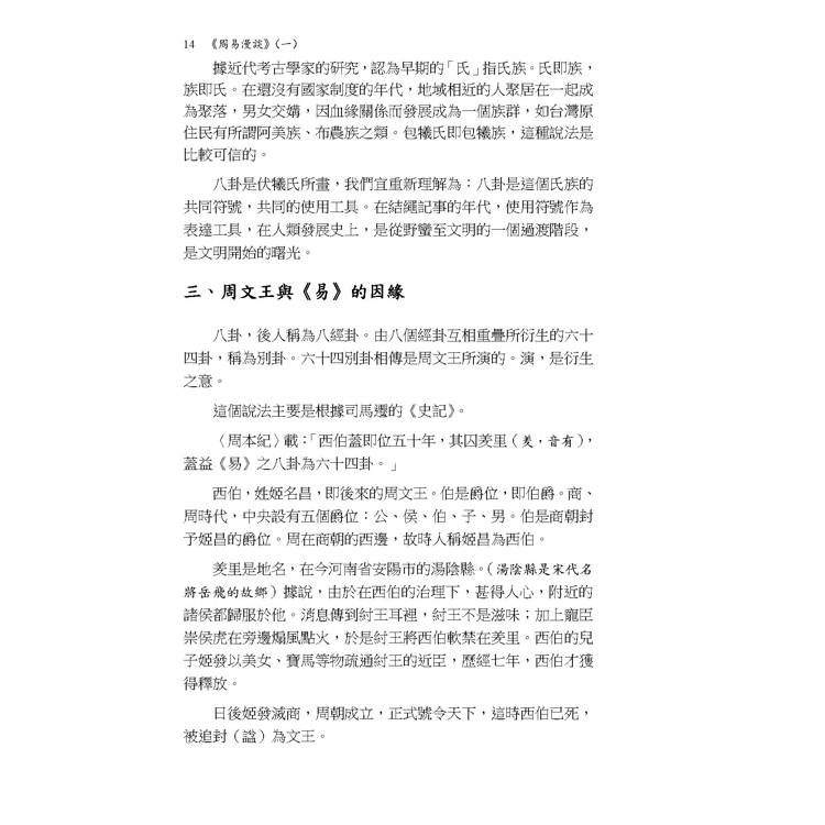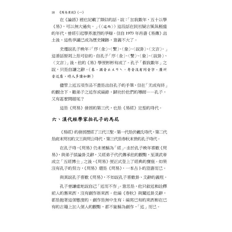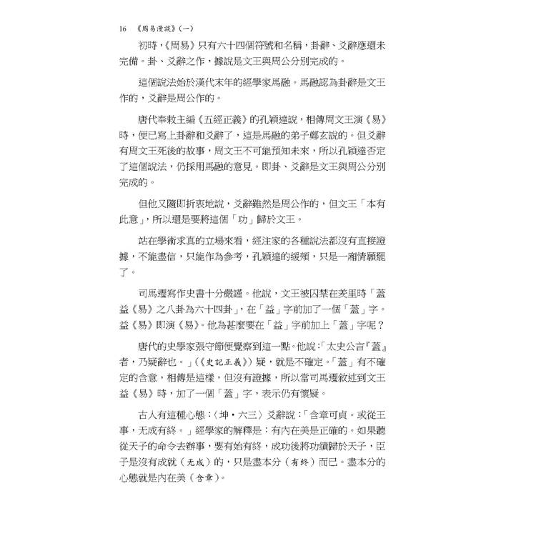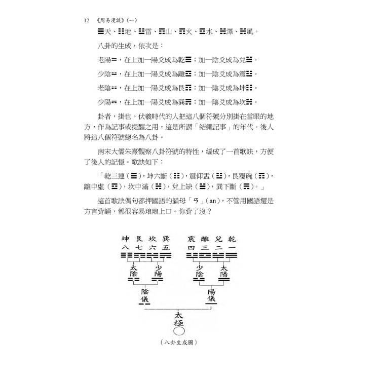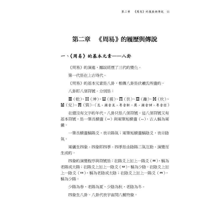 本書修訂改版後先將第一冊付梓印行。本冊內容漫談《易經》的歷史與傳說,然後按六十四卦順序,討論〈乾〉〈坤〉〈屯〉〈蒙〉〈需〉〈訟〉〈師〉〈比〉等八卦。改版前承蒙業師 何廣棪教授賜予閱後〈心得〉一篇鼓勵,謹列於篇首代序,以示感恩。而作者解《易》所使用的方法,讀者也可以透過該序文了解梗概。