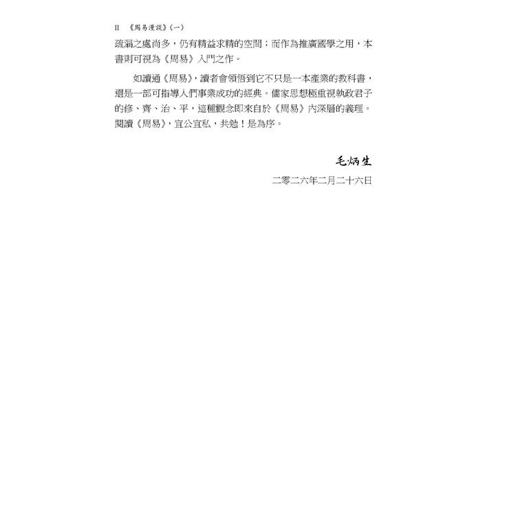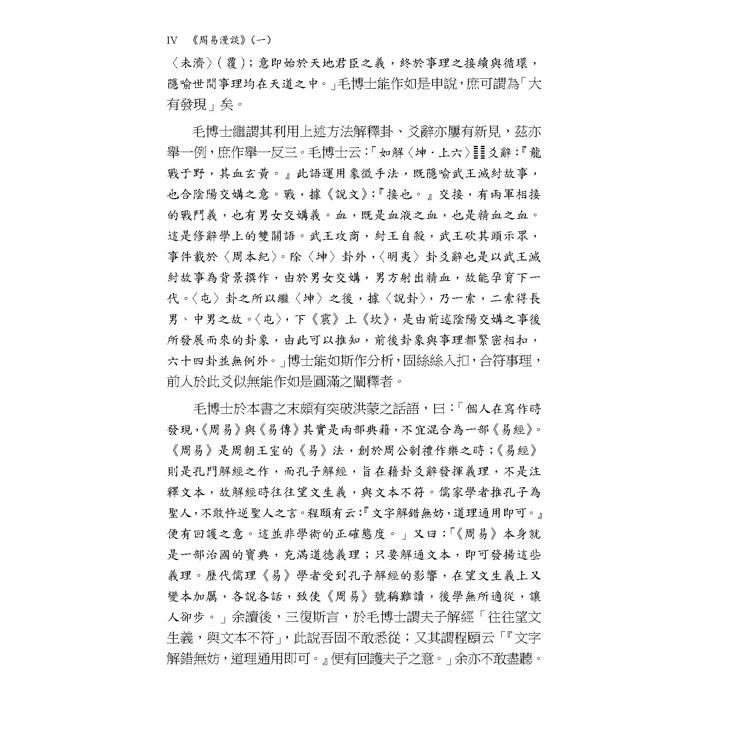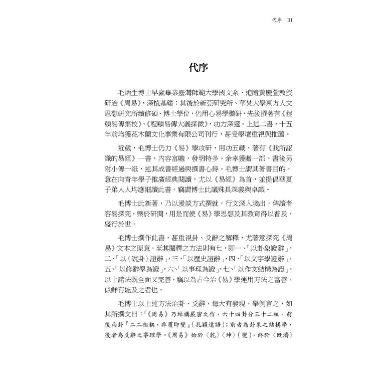 毛博士此新著,乃以漫談方式撰就,行文深入淺出,俾讀者容易探究,樂於研閱,用是而使《易》學思想及其教育得以普及,盛行於世。