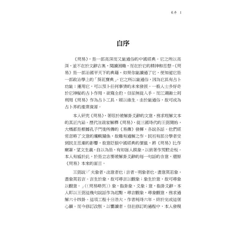 王弼說:「夫象者,出意者也;言者,明象者也。盡意莫若象,盡象莫若言。言生於象,故可尋言以觀象;象生於意,故可尋象以觀意。」(〈周易略例〉)象,指卦象、爻象;意,指卦爻辭。本人即以王弼這幾句說話作為起點,尋言觀象,尋象觀意,務求通解六十四卦。這項工程十分浩大,作者耗時六年,終於完成這個心願。而今修訂改版,以饗讀者。但在修訂的過程中,本人發現疏漏之處尚多,仍有精益求精的空間;而作為推廣國學之用,本書則可視為《周易》入門之作。