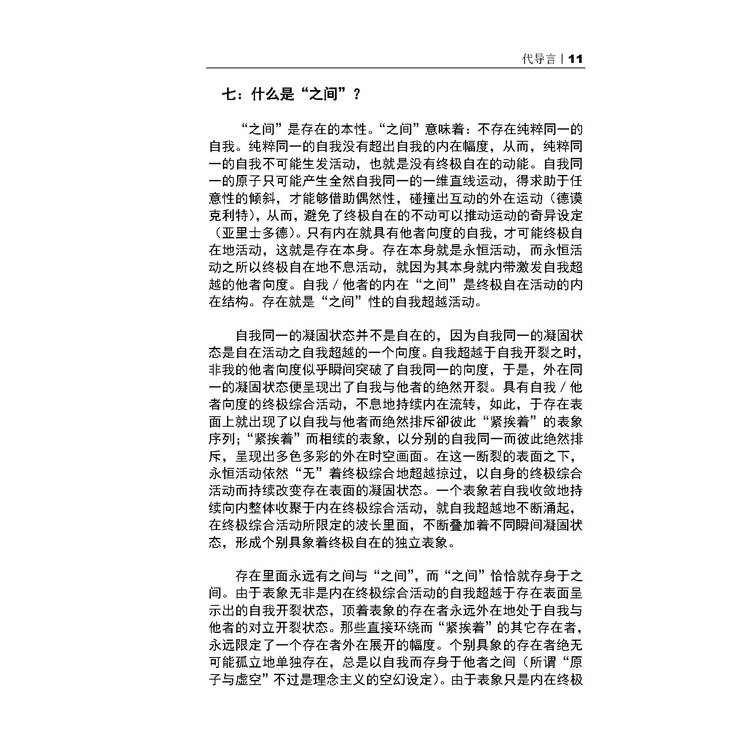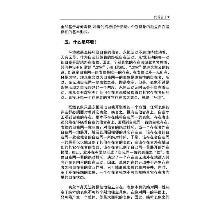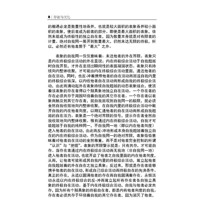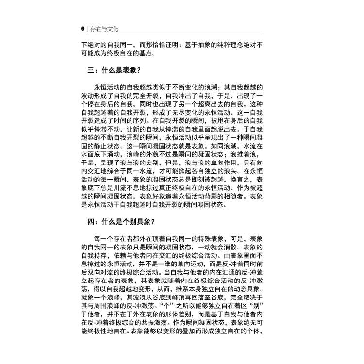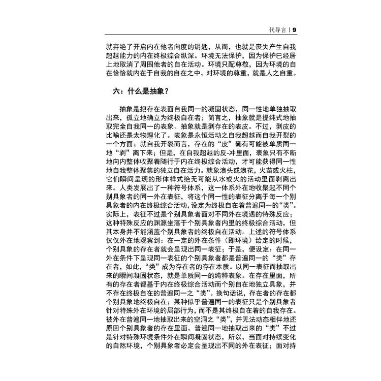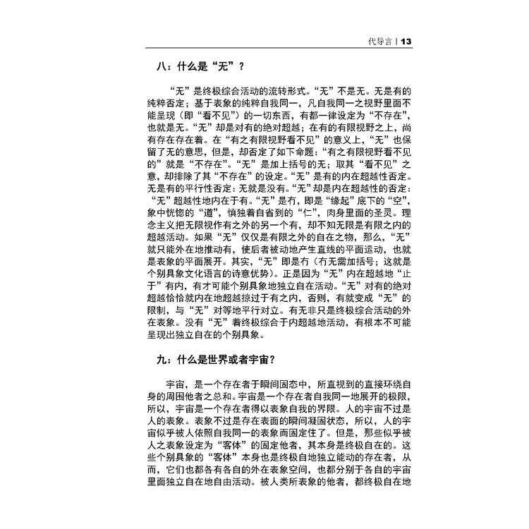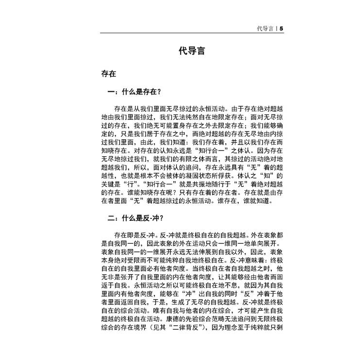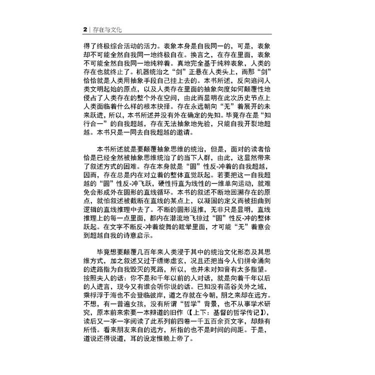 本書所述就是要顛覆抽象思維的統治,但是,面對的讀者恰恰是已經全然被抽象思維統治了的當下人群,由此,這顯然帶來了敘述方式的困難。存在本身就是“圓”性反-沖著的自我超越,因而,存在總是內在對立著的整體直覺躍起。若要把這一自我超越的“圓”性反-沖飛躍,硬性捋直為線性的一維單向運動,就難免會形成外在圓形的直線迴圈。本書的敘述不斷地回溯存在的原點,就怕敘述被截斷在直線的某點上,以凝固的定義而被扭曲到邏輯的直線推理中去了。不斷的圓形返推,無非只是顯明,直線推理上的每一點裡面,都內在潛流地飛掠過“圓”性反-沖的整體躍起。在文字不斷反-沖著旋舞的眩暈裡面,才可能“無”著意會到超越自我的詩意啟示。