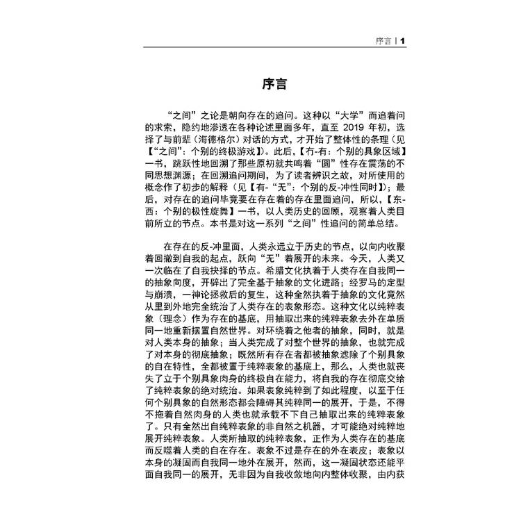 “之間”之論是朝向存在的追問。這種以“大學”而追著問的求索,隱約地滲透在各種論述裡面多年,直至2019年初,選擇了與前輩(海德格爾)對話的方式,才開始了整體性的條理(見【“之間”:個別的終極遊戲】)。此後,【冇-有:個別的具象區域】一書,跳躍性地回溯了那些原初就共鳴著“圓”性存在震盪的不同思想淵源;在回溯追問期間,為了讀者辨識之故,對所使用的概念作了初步的解釋(見【有-“無”:個別的反-沖性同時】);最後,對存在的追問畢竟要在存在著的存在裡面追問,所以,【東-西:個別的極性旋舞】一書,以人類歷史的回顧,觀察著人類目前所立的節點。本書是對這一系列“之間”性追問的簡單總結。
